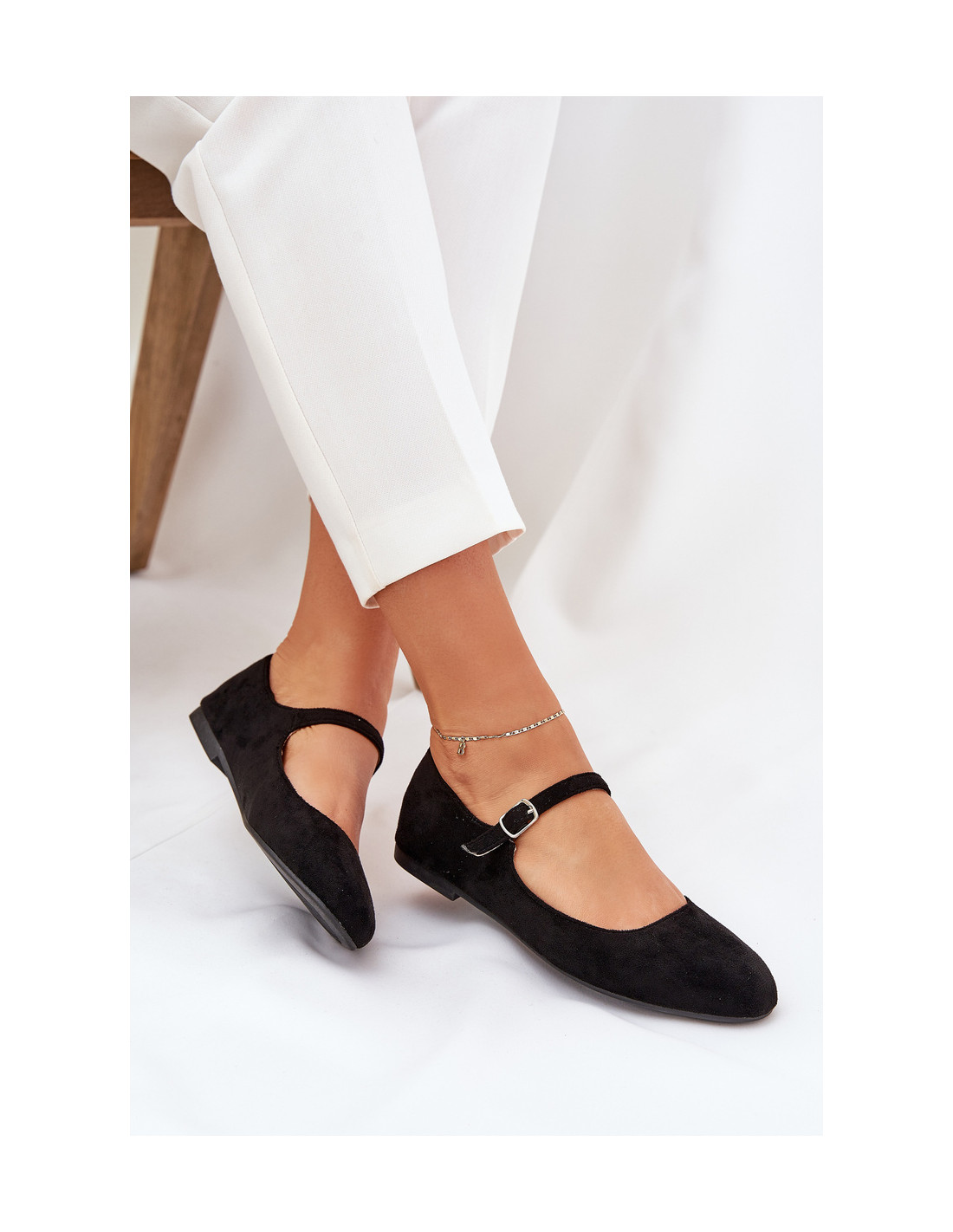Moteriškos balerinos iš ekologiškos zomšos. Modelis turi apvalius pirštus. Vidurio pėdos dirželis, užsegamas sagtimi, suteikia elegancijos ir puikiai priglunda prie pėdos. Šios balerinos yra harmoningas madingo stiliaus ir komforto derinys, todėl puikiai tinka įvairioms progoms. Renkantis dydį, vadovaukitės dydžių lentele.