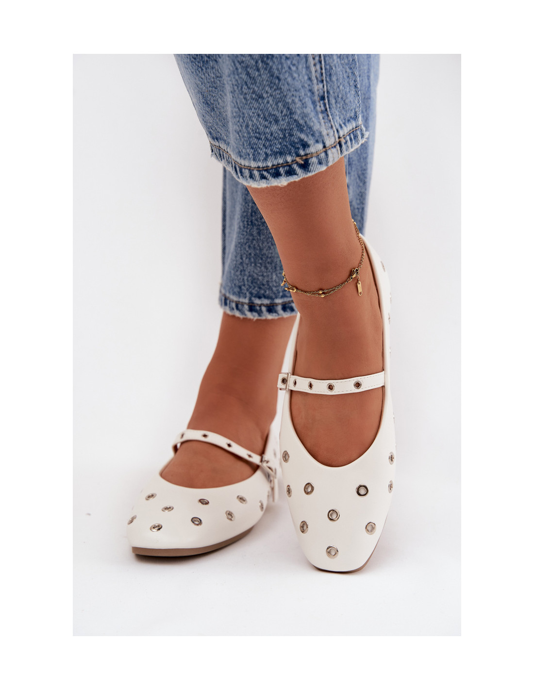 Moteriški baleto bateliai iš dirbtinės odos. Ant plokščio kulno, jie garantuoja komfortą net ir ilgai avint. Reguliuojama sagtis pėdos viduryje užtikrina tobulą prigludimą ir suteikia stiliaus. Dekoratyviniai lankeliai išskiria modelį, suteikdami jam madingą ir originalų vaizdą. Šie universalūs baleto bateliai puikiai tinka kasdieniam stiliui – derinami su kelnėmis, suknelėmis ar sijonais.