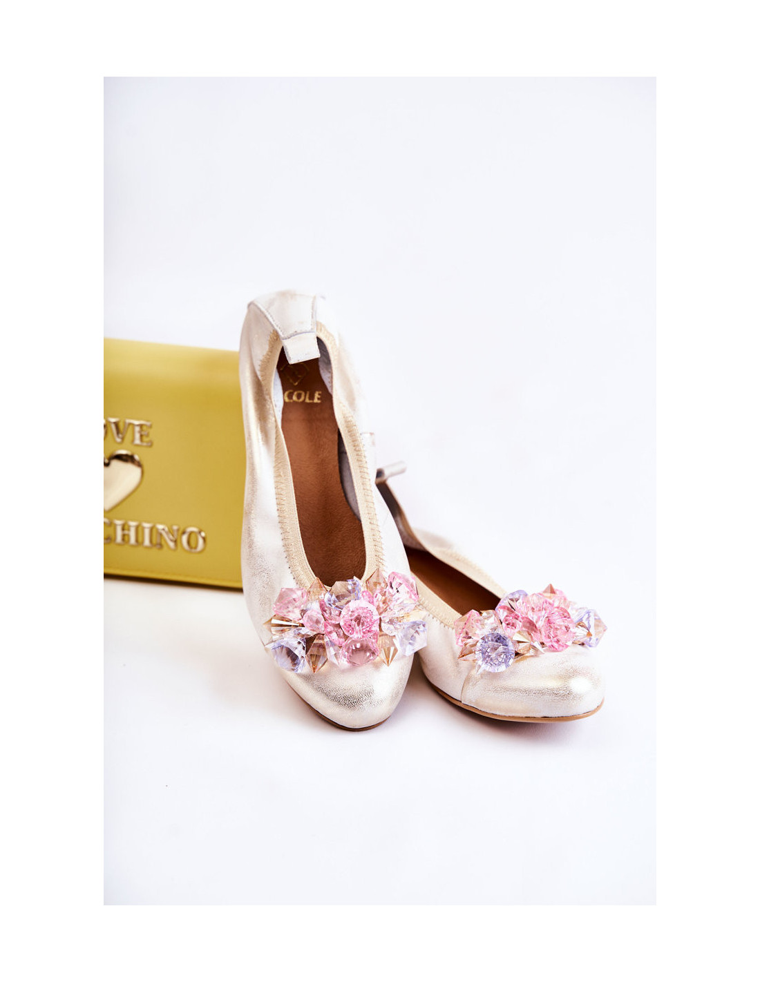 Moteriškos balerinos iš aukštos kokybės natūralios odos. Jie turi šiek tiek suapvalintą pirštą. Užsegamas modelis su raišteliu. Jie montuojami ant žemo, plokščio kulno. Priekyje yra krištolo formos ornamentas. Vidpadis iš natūralios odos yra minkštas ir patogus naudoti. Komfortas garantuotas! Šį modelį tikrai turėtumėte turėti savo garderobe! Renkantis dydį, naudokite dydžių lentelę.
