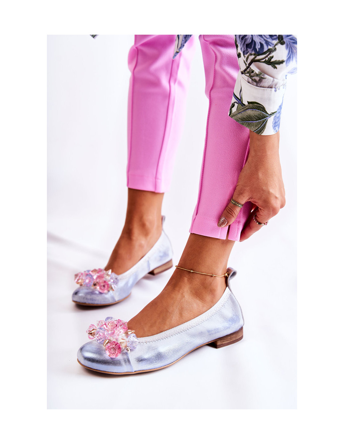 Moteriškos balerinos iš aukštos kokybės natūralios odos. Jie turi šiek tiek suapvalintą pirštą. Užsegamas modelis su raišteliu. Jie montuojami ant žemo, plokščio kulno. Priekyje yra krištolo formos ornamentas. Vidpadis iš natūralios odos yra minkštas ir patogus naudoti. Komfortas garantuotas! Šį modelį tikrai turėtumėte turėti savo garderobe! Renkantis dydį, naudokite dydžių lentelę.