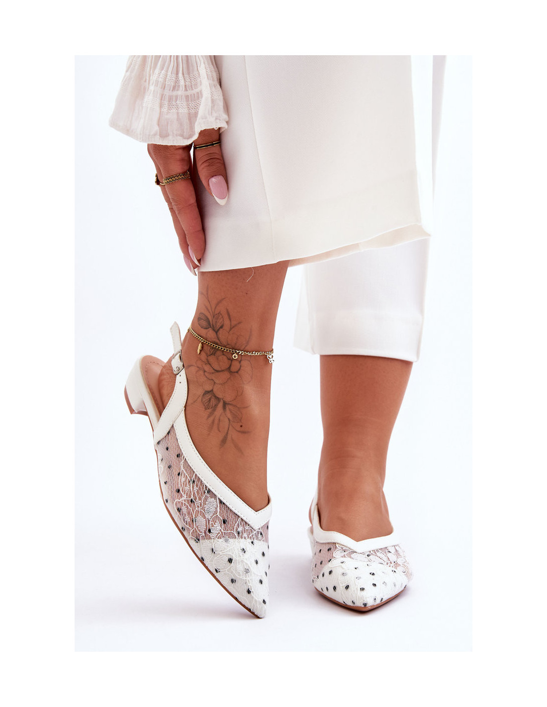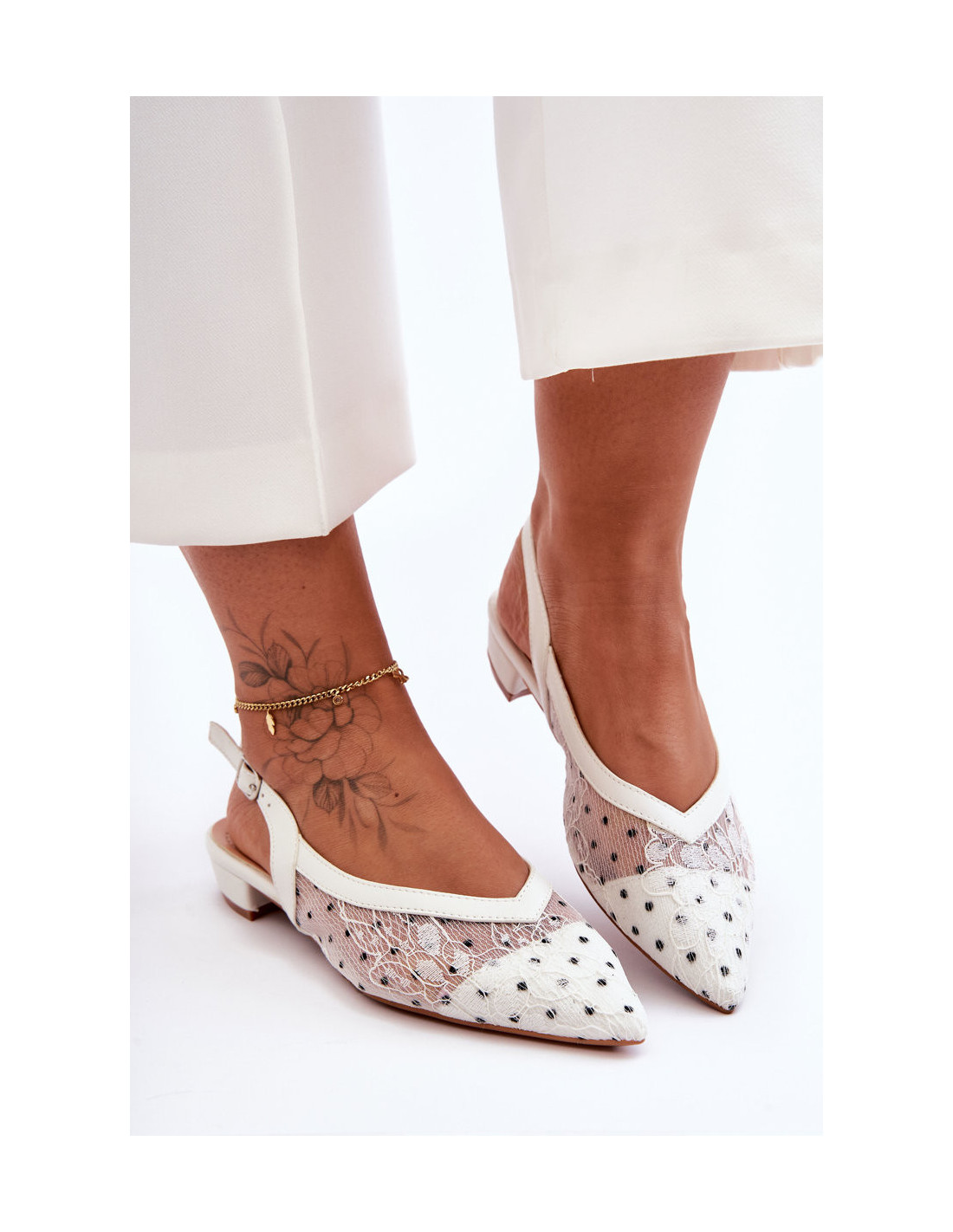 Šios elegantiškos balerinos atviru kulnu ir smailiu pirštu jums tikrai patiks! Jie pagaminti iš kvėpuojančios medžiagos ir eko odos derinio. Jie turi sagtį su reguliuojamu dirželiu. Minkštas, eko odos vidpadis suteiks komforto dėvint. Balerinos turi plokščią kulną, todėl jausitės stabiliai. Renkantis dydį, vadovaukitės dydžių lentele.