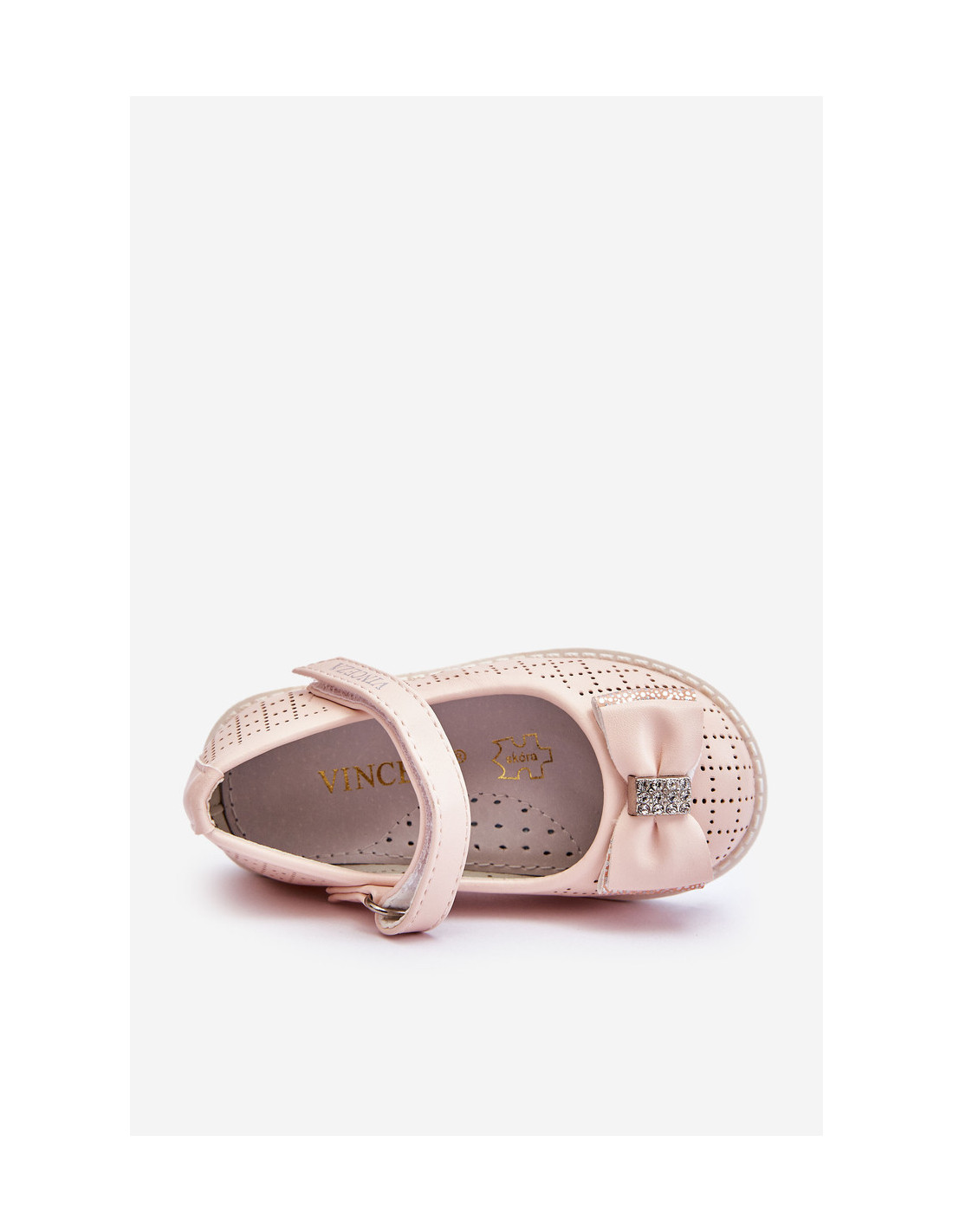 Madingos vaikiškos balerinos pagamintos iš ekologiškos odos. Jie turi klasikinį Velcro užsegimą. Minkštas vidpadis iš natūralios odos su subtilia perforacija leis vaikui patogiai naudotis avalyne. Nuostabus lankelis batų priekyje leidžia šioms balerinoms atrodyti tikrai mielai. Šių balerinų padas pagamintas iš guminės medžiagos ir papildomai neslidus. Rinkdamiesi dydį, vadovaukitės dydžių lentele.