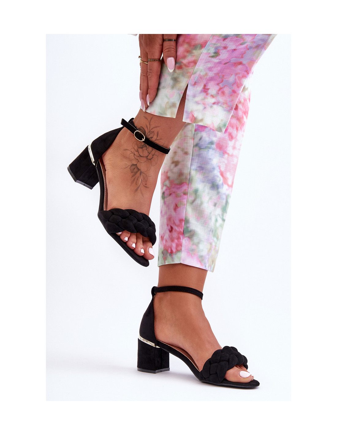 Klasikinės basutės priekyje buvo praturtintos nuostabia pyne. Jie tvirtinami ant žemo kulno stabilaus stulpelio pavidalu. Sandalai pagaminti iš malonios liesti ekologiškos zomšos. Be to, jie turi standintą kulną. Vidpadis pagamintas iš eko odos ir užtikrina patogumą naudojant avalynę. Atvira, suapvalinta nosis. Šis modelis aplink kulkšnį užsegamas reguliuojamu dirželiu su sagtimi. Renkantis dydį, vadovaukitės dydžių lentele.