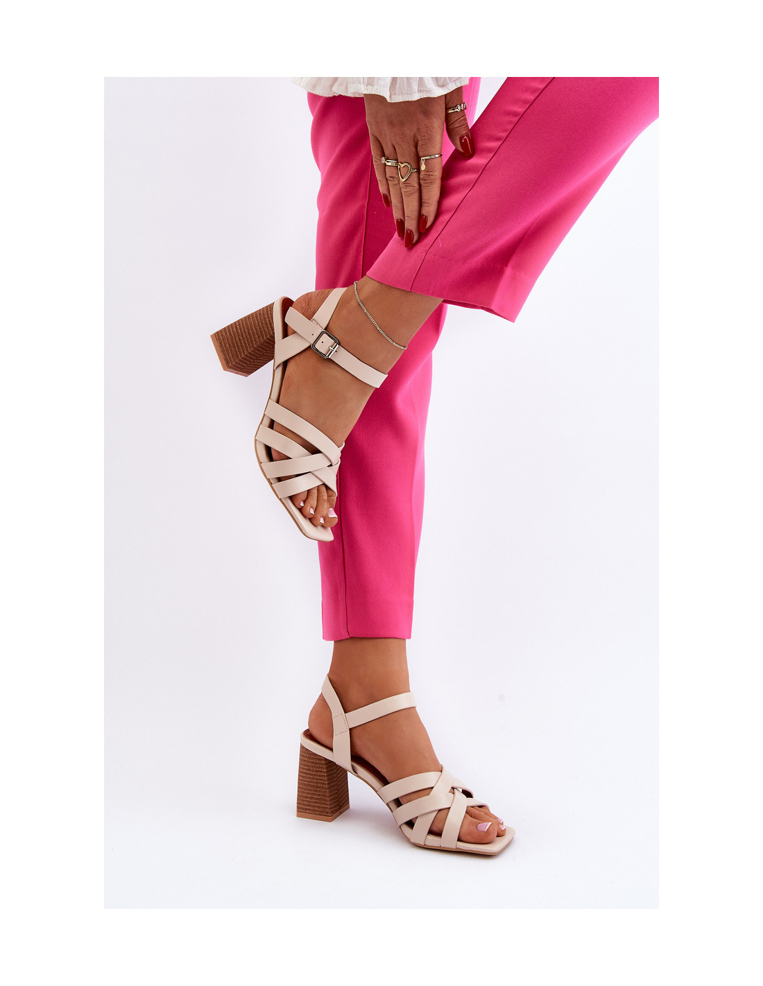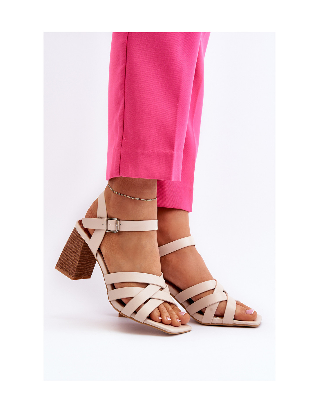 Aukštakulnės basutės – puikus pasirinkimas vertinantiems stabilumą ir patogumą. Pagaminti iš vienos spalvos ekologinės odos, priekyje yra keturios sujungtos juostelės, kurios suteikia jūsų vasaros garderobui elegancijos ir stiliaus natų. Dėl reguliuojamo dirželio su sagtimi galite būti tikri, kad batai gerai priglus prie pėdos. Šis modelis puikiai atrodo prie raštuotų suknelių ar elegantiškų kelnių. Renkantis dydį, vadovaukitės dydžių lentele.