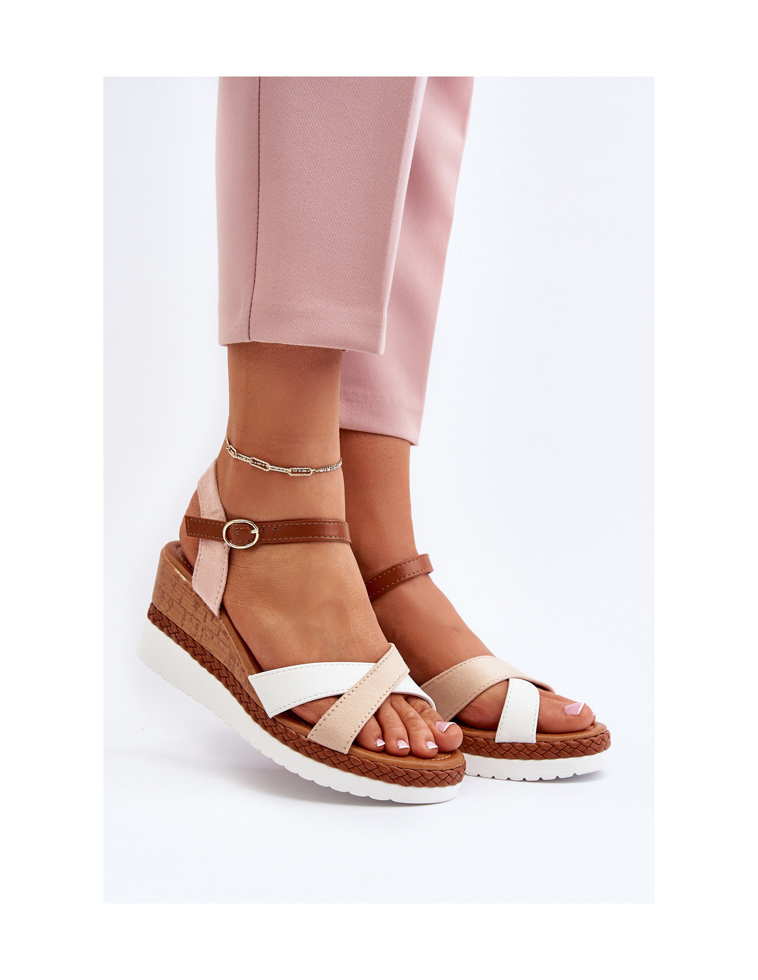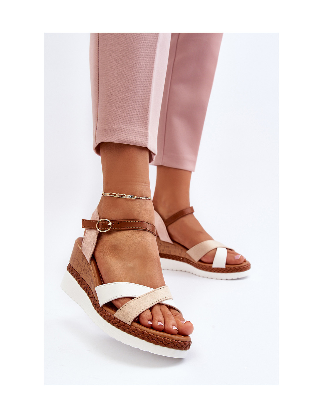 Unikalūs moteriški sandalai sujungia stilingą platformą su pleištu ir sukuria akį traukiantį dizainą. Jų unikali išvaizda atsiranda dėl susipynusių juostelių, kurios suteikia jiems unikalų charakterį. Be to, minkštas vidpadis iš eko odos garantuoja patogumą dėvėti net ir ilgą laiką. Batai aplink kulkšnį susegti sagtimi su reguliuojamu dirželiu, kuris leidžia tinkamai priglusti prie pėdos. Tai puikus pasirinkimas ieškantiems stiliaus ir komforto vasariškame stiliuje! Renkantis dydį, vadovaukitės dydžių lentele.
