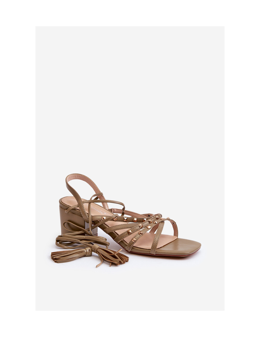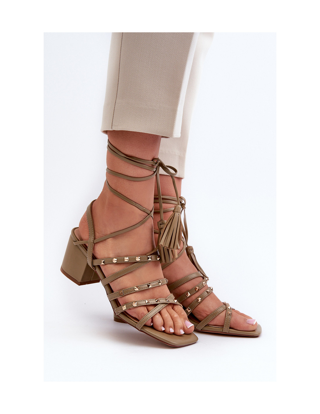 Stilingi moteriški sandalai iš eko odos. Priekyje susipynusios juostelės papildomai dekoruotos smeigėmis. Modelis surištas. Šios basutės puikiai tiks vasaros dienoms, jos puikiai papildys jūsų vasaros garderobą, suteiks stiliaus ir originalumo. Renkantis dydį, vadovaukitės dydžių lentele.