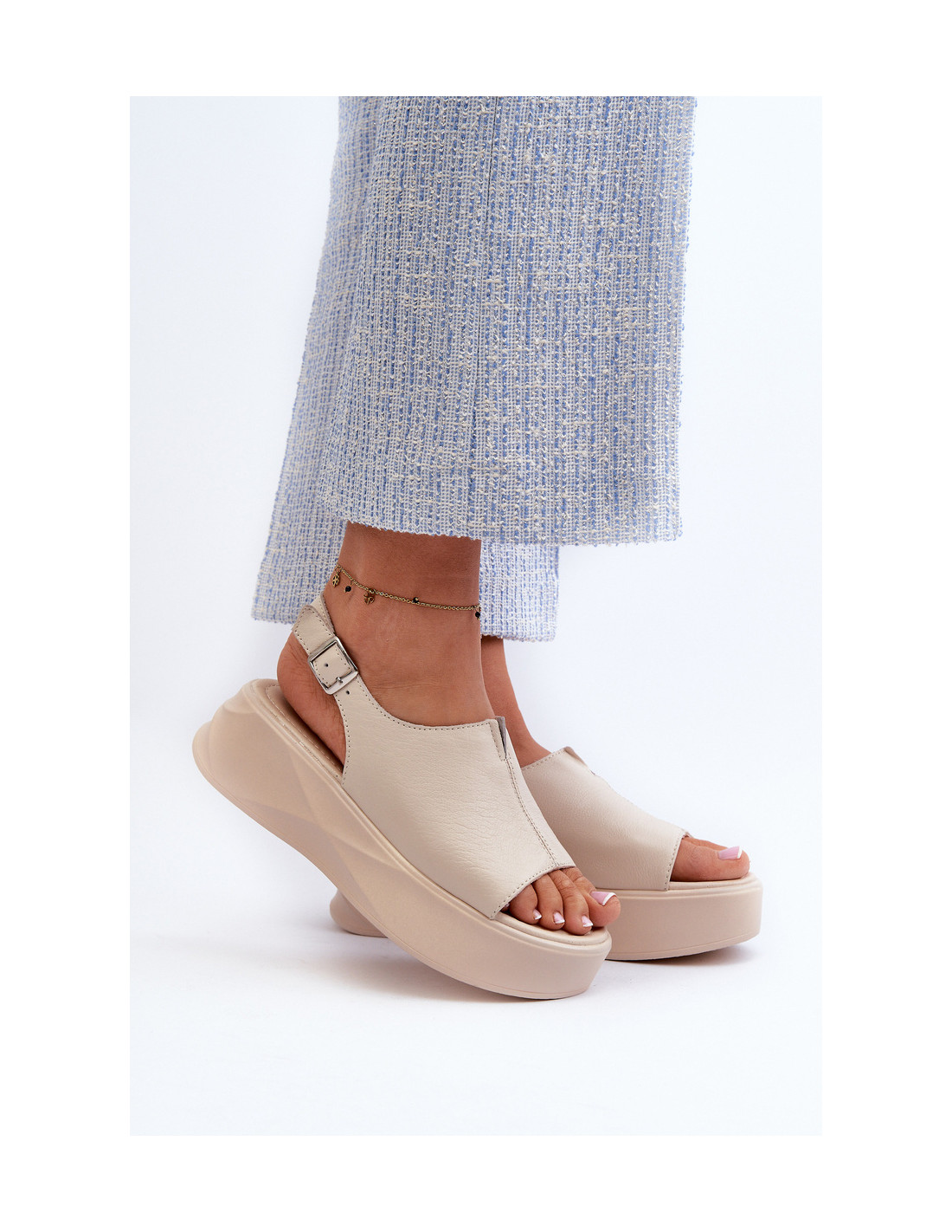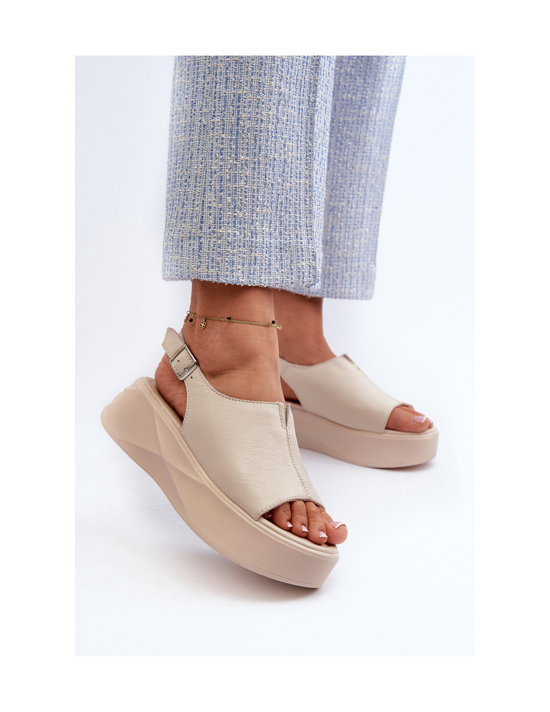 Moteriškos basutės yra pagamintos iš aukštos kokybės natūralios odos, kuri garantuoja ilgaamžiškumą. Ant masyvios platformos jie suteikia stabilumo ir papildomo aukščio. Dėl reguliuojamo dirželio su sagtimi lengvai ir tiksliai priglunda prie pėdos. Dėl madingo dizaino jie puikiai papildo jūsų vasaros garderobą, pridedant stiliaus ir pasitikėjimo bet kokiais drabužiais! Renkantis dydį, vadovaukitės dydžių lentele.