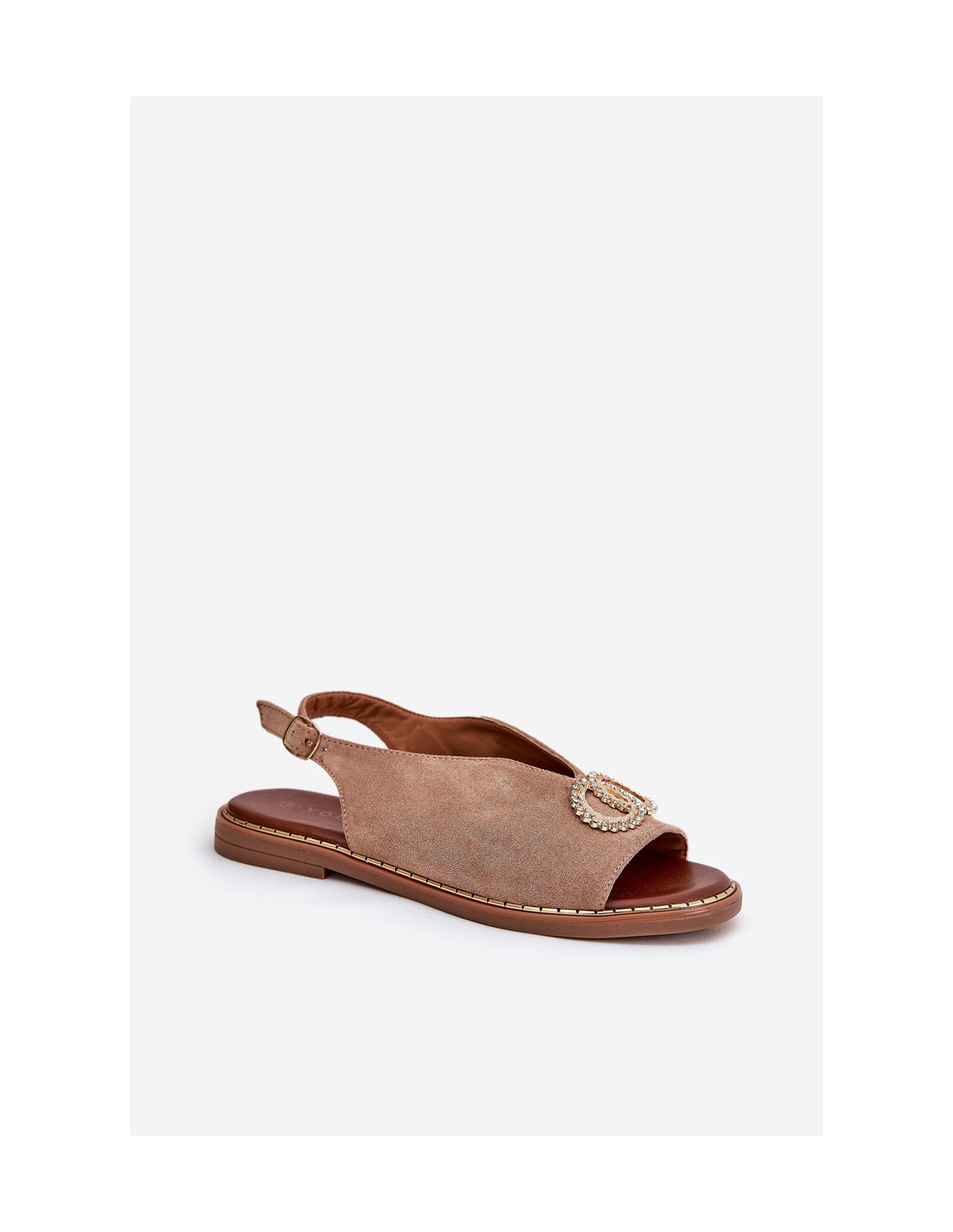 Moteriški sandalai su puošmena ant plokščio kulno ekologinės zomšos tamsiai smėlio spalvos ralis