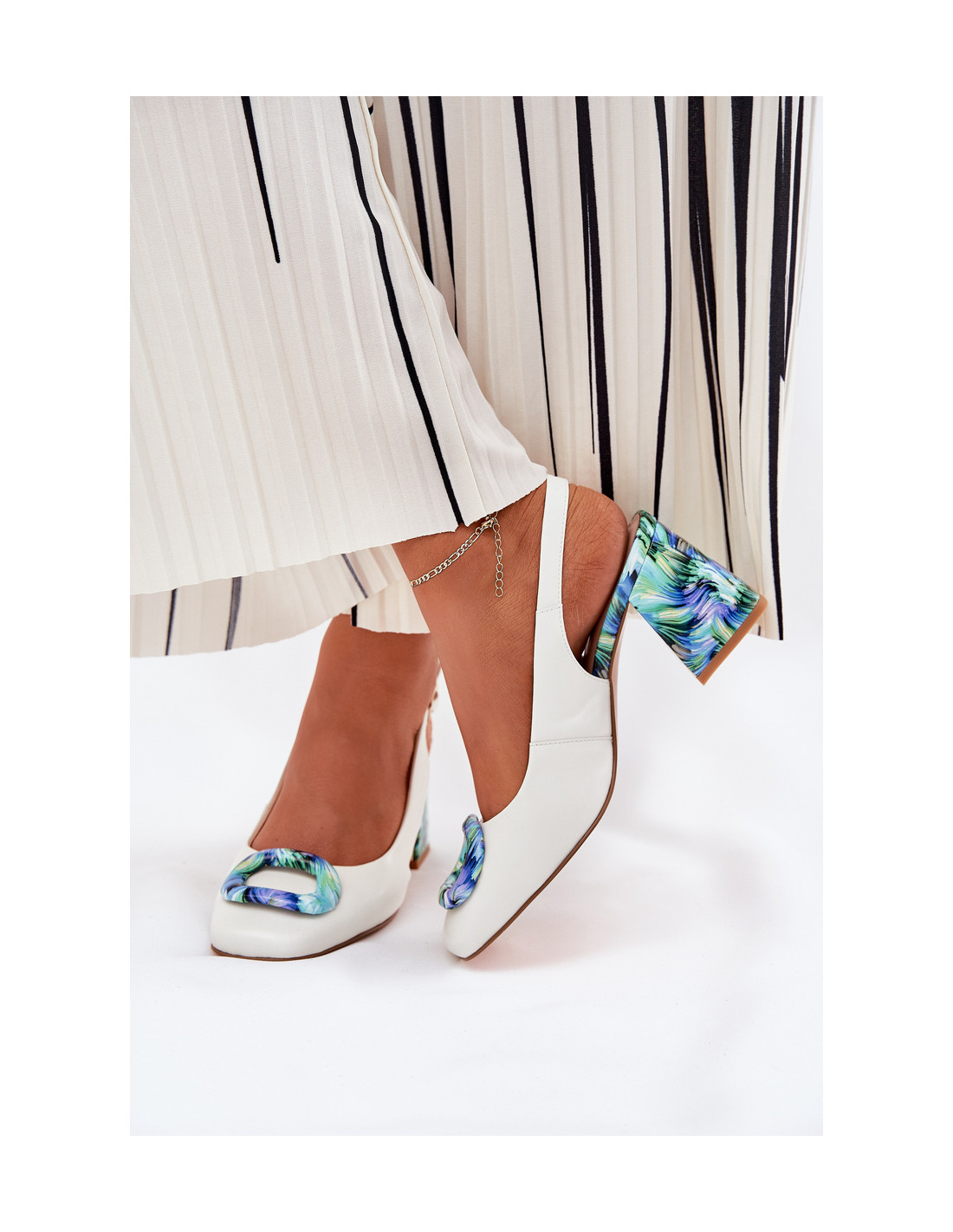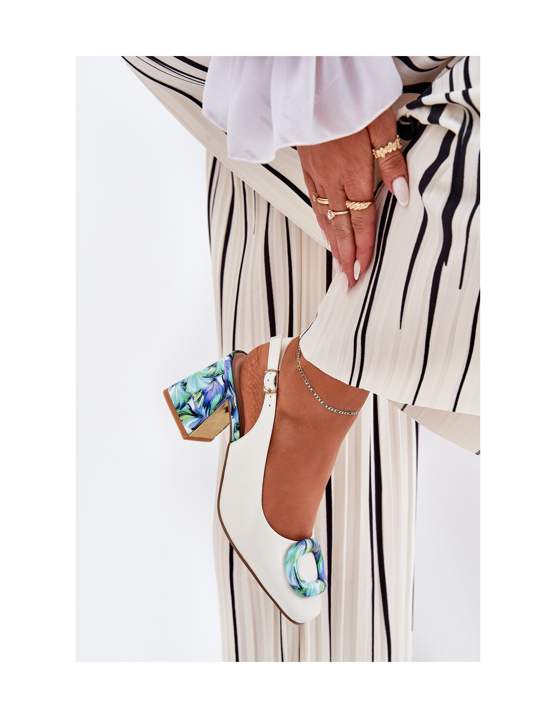 Elegantiški moteriški sandalai iš natūralios odos – tai stiliaus ir patogumo derinys viename. Pirštai padengti, kas suteikia jiems klasikinį charakterį, o dekoratyvi detalė priekyje papildomai pabrėžia išskirtinį charakterį. Įdomiu raštu dekoruotas kulnas puikiai dera prie visumos, užtikrina stabilumą ir patogumą. Sandalai užsegami reguliuojamu dirželiu su sagtimi, kuri leidžia puikiai priglusti prie pėdos, o minkštas odinis vidpadis garantuoja patogumą dėvėti visą dieną. Puikiai tinka įvairioms progoms. Renkantis dydį, vadovaukitės žemiau esančia dydžių lentele.