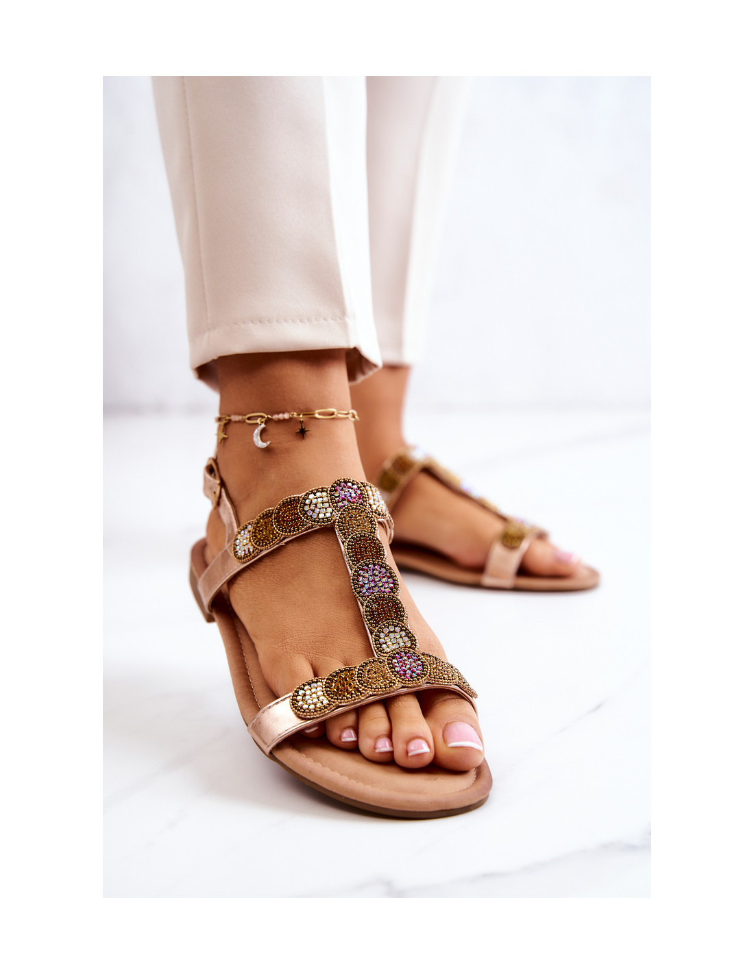 Sandalai plokščiakulniais. Su eko odos dirželiais aplink pirštus ir kulnus, kurie per vidurį sujungiami kitu dirželiu. Užsegama sagtimi su reguliuojamu dirželiu. Daugybė cirkonio imitacijos cirkonio ant juostelių. Erdvus modelis, puikiai tinkantis vasarai. „Comfort Shoes“ ekologiškos odos vidpadis yra minkštas ir patogus naudoti. Taip pat turėtumėte pasidomėti ir kitais mūsų pasiūlyme esančiais basučių modeliais! Renkantis dydį, naudokite dydžių lentelę.