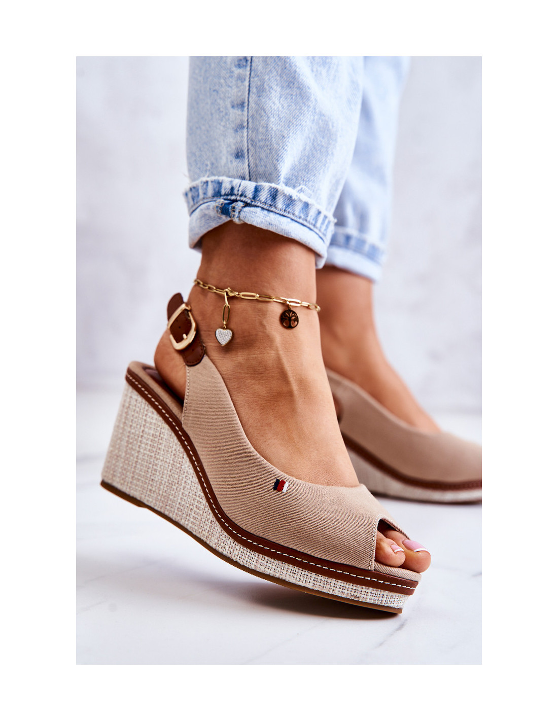 Gražūs ir patogūs sandalai, tvirtinami ant kulno pleišto pavidalu. Madingos spalvos ir nesenstantis dizainas. Sandalai turi neslidų padą ir pintą pleištą. Pagaminta iš tekstilės medžiagos. Jie turi reguliuojamą dirželį, užsegamą sagtimi. Jie turi atvirą kulną ir pirštus. Vidpadis pagamintas iš medžiagos ir eko odos įdėklų derinio. Būtinai peržiūrėkite visą mūsų moteriškų basučių asortimentą! Renkantis dydį, naudokite dydžių lentelę.