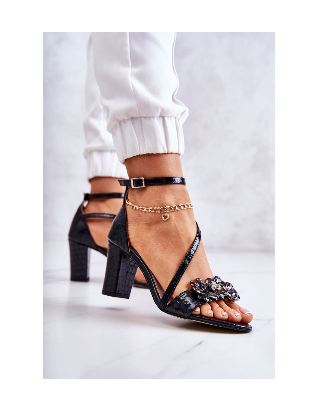 Gražūs aukštakulniai sandalai, pagaminti atkreipiant dėmesį į detales iš aukštos kokybės natūralios odos. Jų priekyje yra juostelė su elegantišku ornamentu imitacinių kristalų ir kubinio cirkonio pavidalu. Per vidurį užsegamas dirželis sujungiamas su standintu kulnu. Užsegama aplink kulkšnį reguliuojamu dirželiu su sagtimi. Minkštas vidpadis iš natūralios odos suteiks komforto ir patogumo. Stabilus stulpelio formos kulnas. Puikūs batai visoms šventėms. Renkantis dydį, naudokite dydžių lentelę.