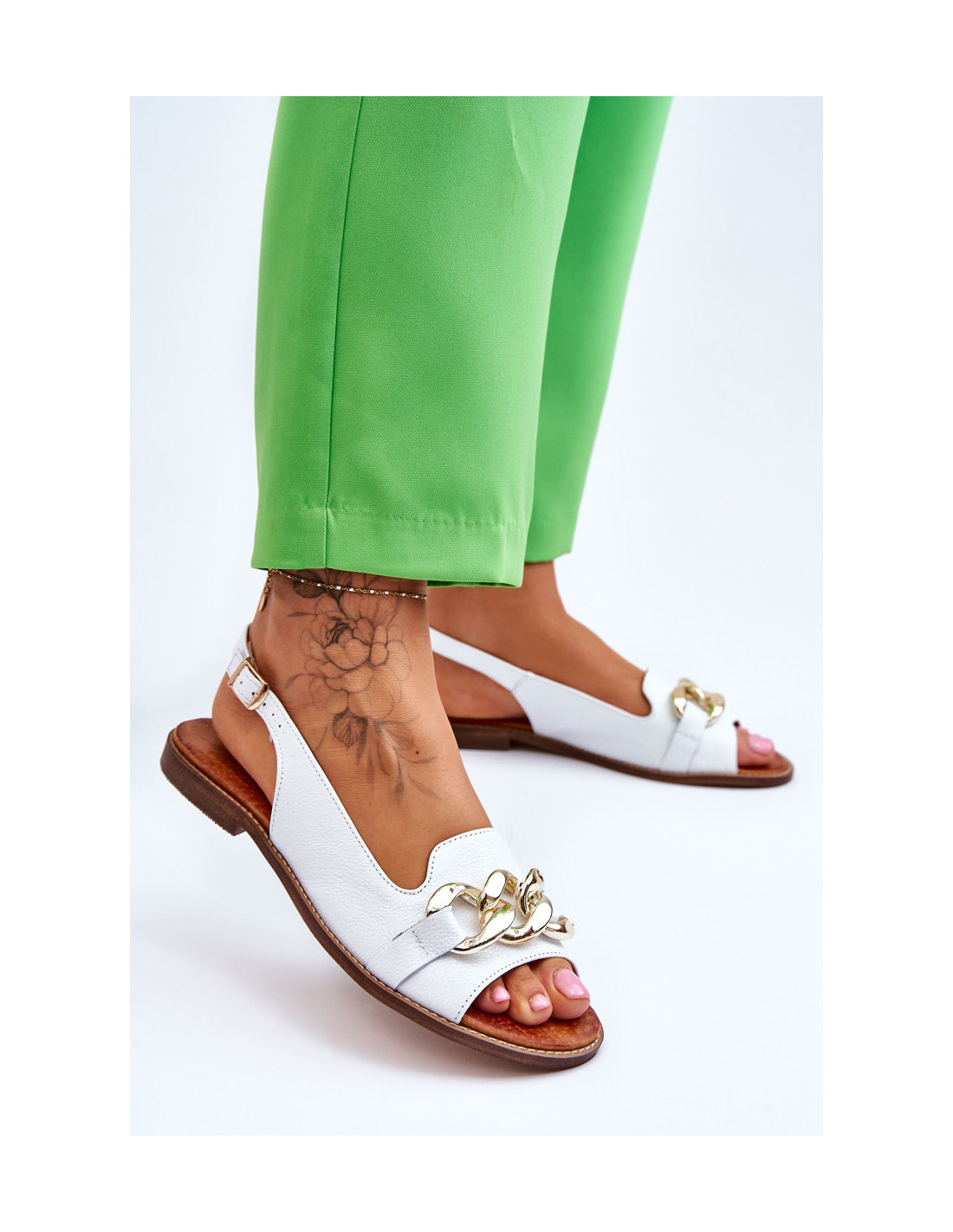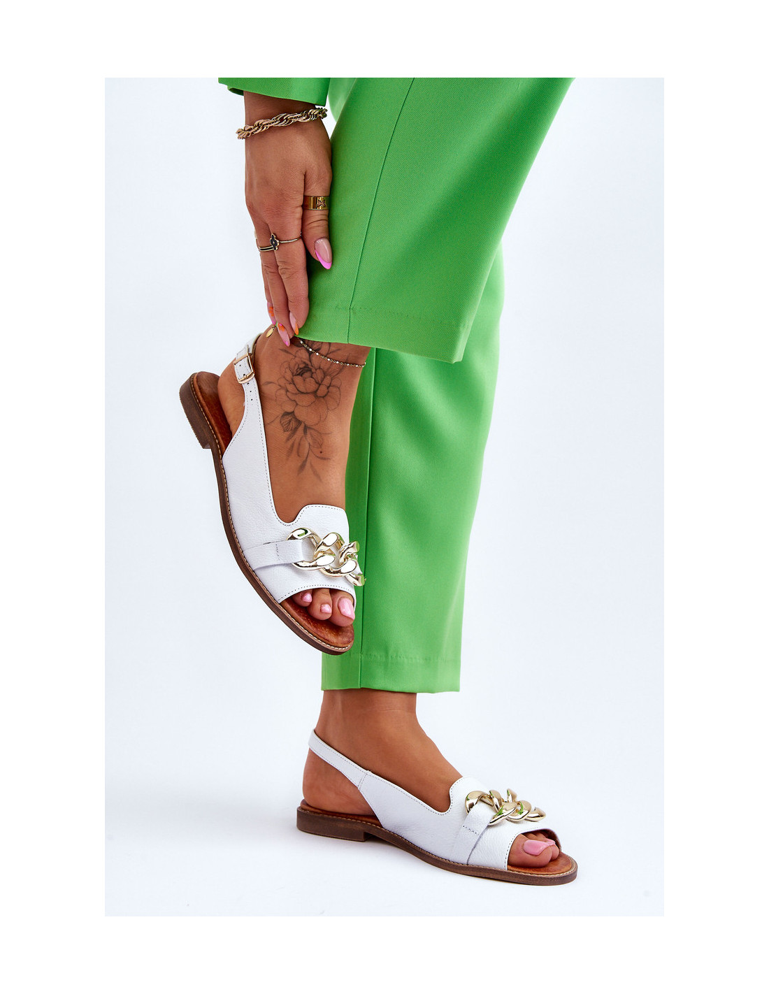 Moteriški sandalai pagaminti iš natūralios odos. Jų priekyje yra plastikinės grandinės formos apdaila. Sandalai buvo uždėti ant plokščio kulno. Šis modelis užsisega reguliuojamu dirželiu su sagtimi. Puikiai tinka karštoms dienoms, tiek prie suknelių, tiek prie kelnių. Rinkdamiesi dydį žiūrėkite dydžių lentelę.