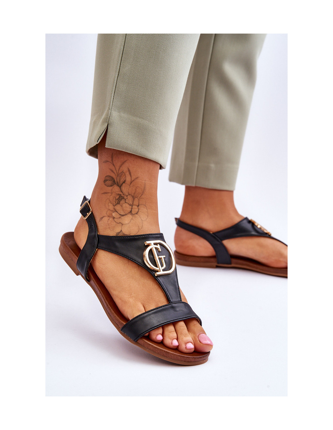 Gražūs, moteriški sandalai iš aukštos kokybės eko odos. Šis modelis turi raidžių formos papuošimą ant dirželio. Sandalai užsegami reguliuojamu dirželiu su sagtimi. Patogus vidpadis Comfort puikiai tinka ilgalaikiam avalynės naudojimui. Sandalai yra ant plokščio kulno su neslidžiu padu. Rinkdamiesi dydį, vadovaukitės dydžių lentele.