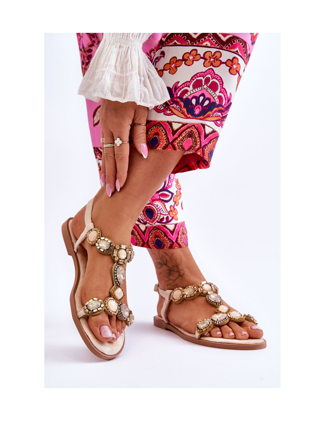 Gražūs moteriški sandalai pagaminti iš malonios liesti ekologiškos zomšos. Šis modelis turi dekoracijas – blizgučius, akmenėlius ir blizgančius kalnų krištolus. Sandalai užsegami reguliuojamu dirželiu su sagtimi. Patogus vidpadis iš ekologiškos zomšos puikiai tinka ilgalaikiam avalynės naudojimui. Sandalai yra ant plokščio kulno su neslidžiu padu. Rinkdamiesi dydį, vadovaukitės dydžių lentele.