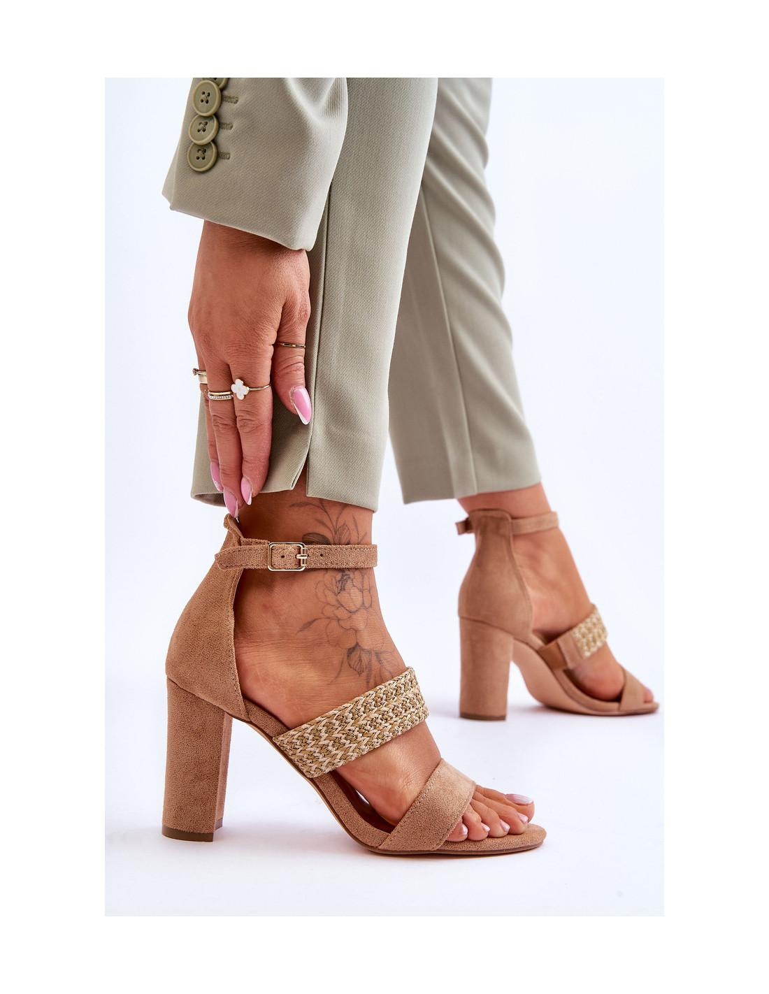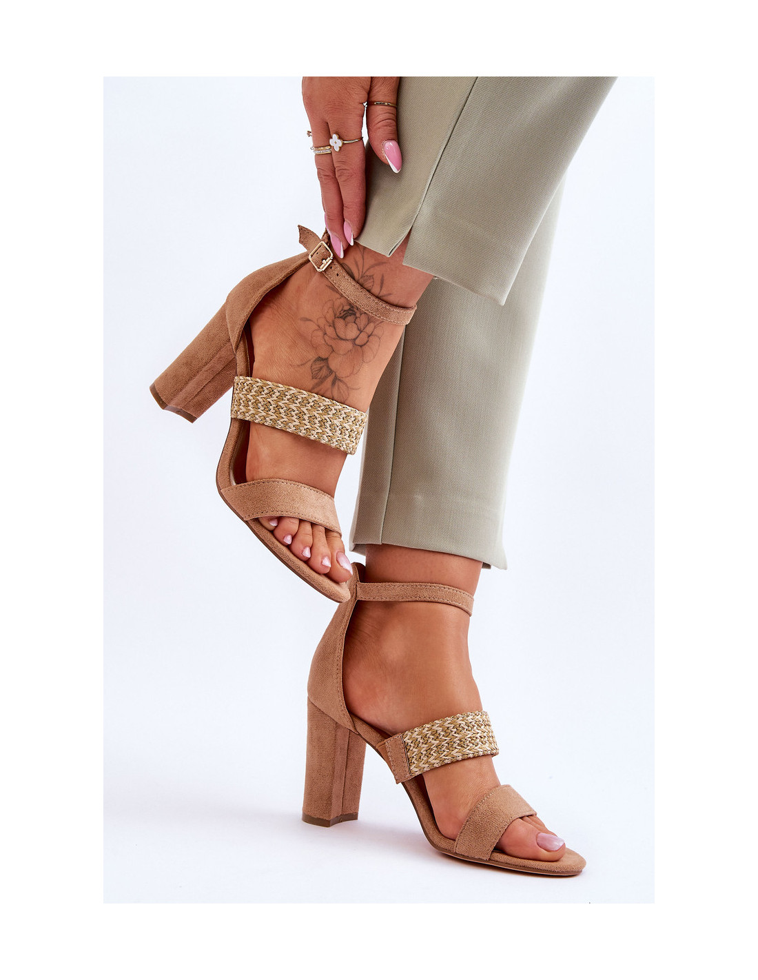 Sandalai pagaminti iš ekologiškos zomšos. Šio modelio viduryje yra pintas dirželis, o viršuje reguliuojamas dirželis, užsegamas sagtimi. Šių batų vidpadis yra minkštas ir pagamintas iš eko odos. Be to, kulnas standinamas. Sandalai buvo pastatyti ant kulno stulpelio pavidalu. Rinkdamiesi dydį žiūrėkite dydžių lentelę.