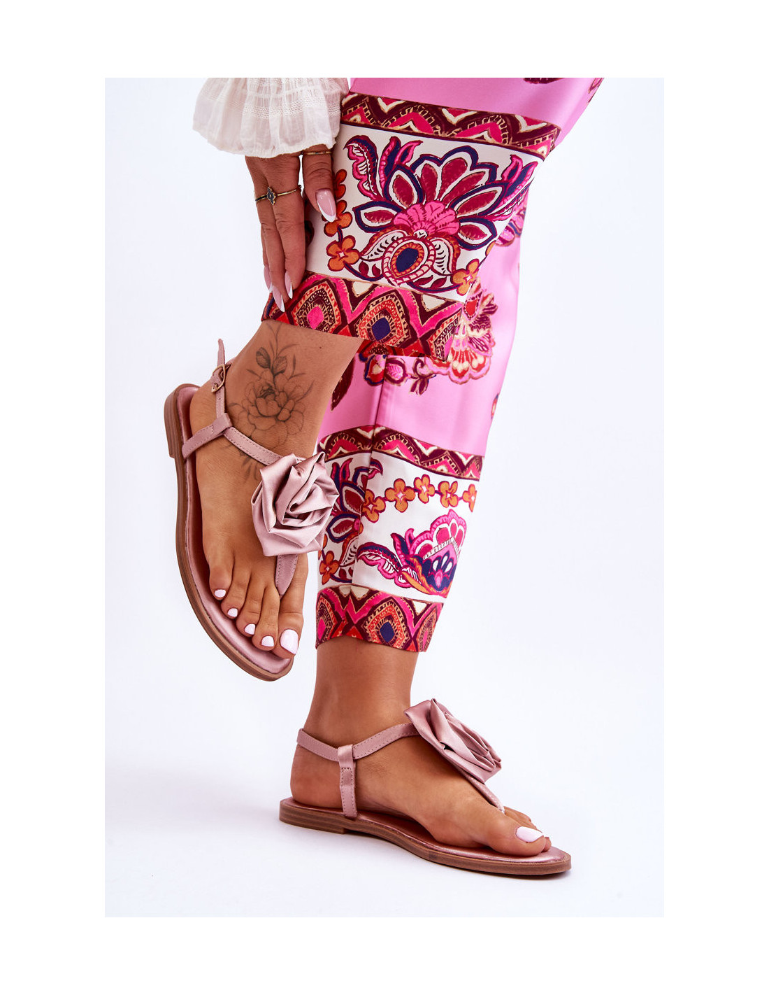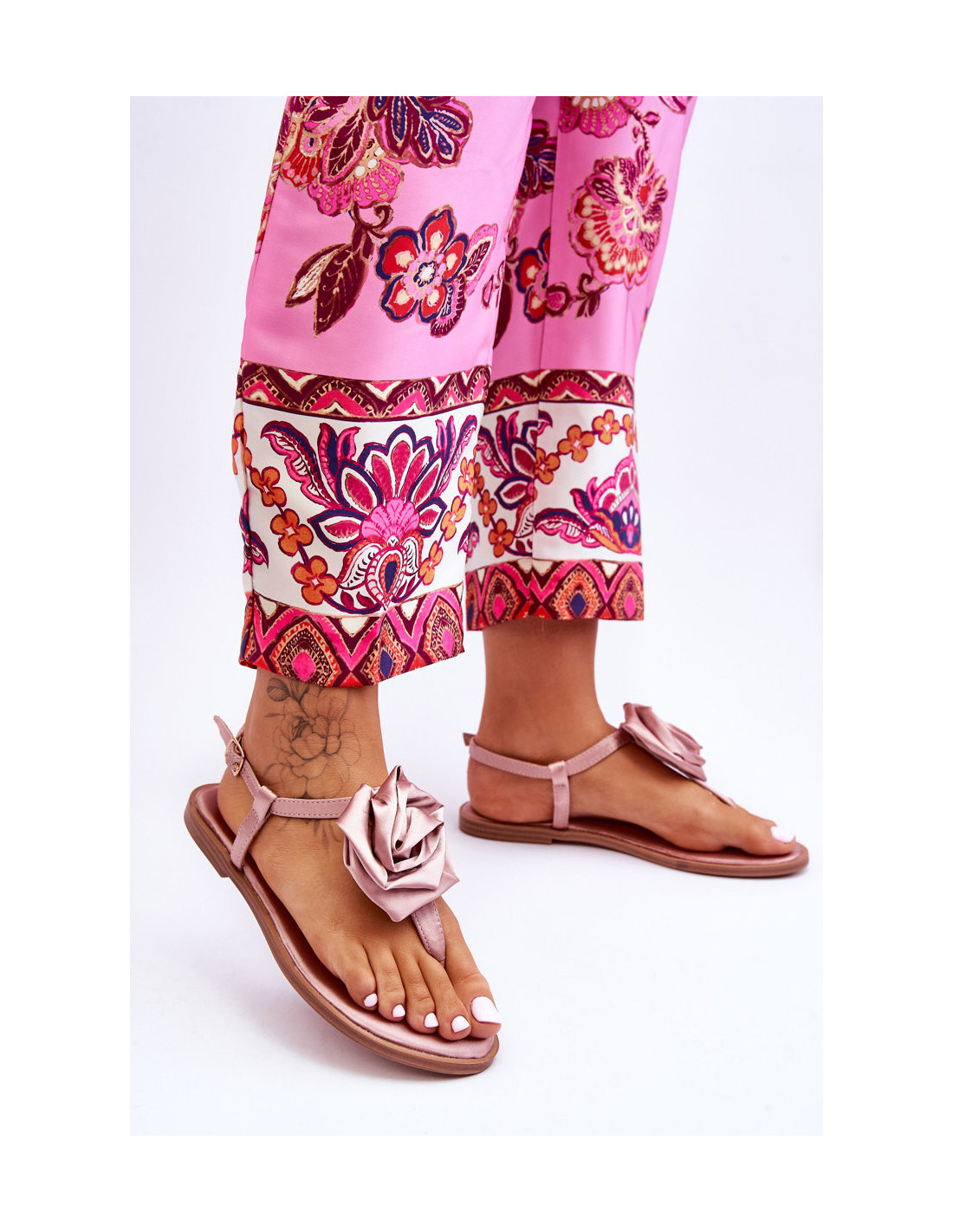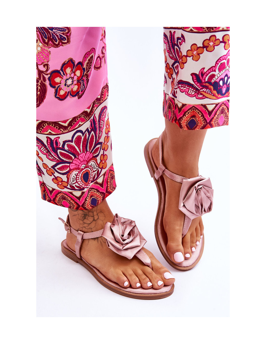 Moteriškos basutės yra pagamintos iš satiną imituojančios tekstilės medžiagos. Dekoruota didele, medžiagine rože viduryje. Šlepetės stiliaus sandalai ant plokščio kulno. Jie užsegami reguliuojamu dirželiu su sagtimi. Minkštas vidpadis pagamintas iš medžiagos. Rinkdamiesi dydį, vadovaukitės dydžių lentele.
