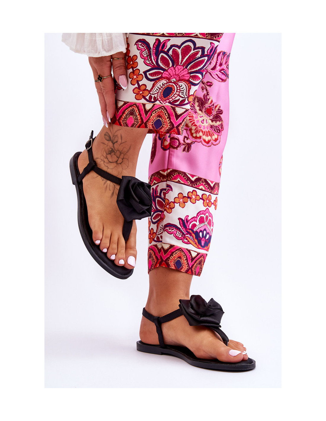 Moteriškos basutės yra pagamintos iš satiną imituojančios tekstilės medžiagos. Dekoruota didele, medžiagine rože viduryje. Šlepetės stiliaus sandalai ant plokščio kulno. Jie užsegami reguliuojamu dirželiu su sagtimi. Minkštas vidpadis pagamintas iš medžiagos. Rinkdamiesi dydį, vadovaukitės dydžių lentele.
