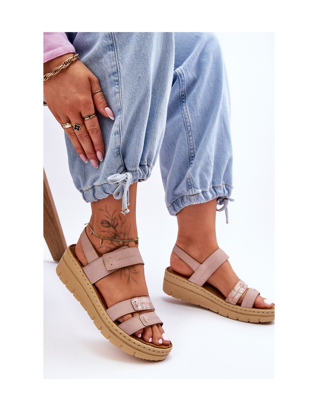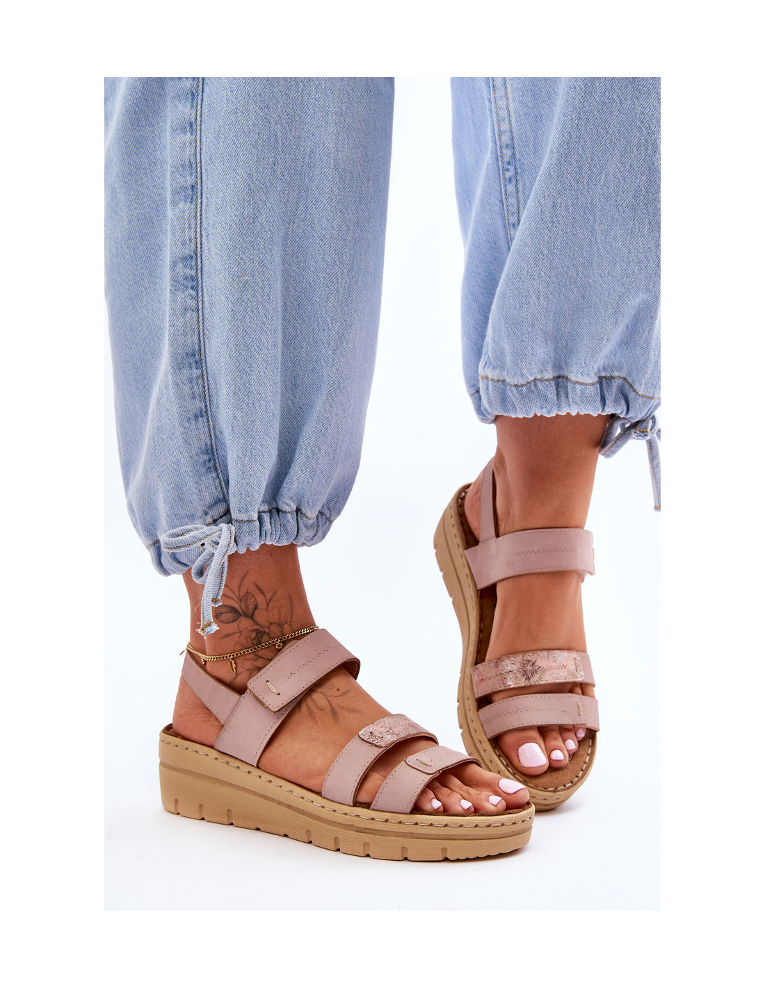 Klasikiniai moteriški sandalai yra pagaminti iš ekologiškos odos. Šis modelis buvo sumontuotas ant pleišto ir platformos. Minkštas vidpadis iš natūralios zomšos papildomai turi perforacijas. Puikus modelis karštoms dienoms. Sandalai turi Velcro užsegimą. Šis modelis turėtų būti jūsų! Rinkdamiesi dydį žiūrėkite dydžių lentelę.