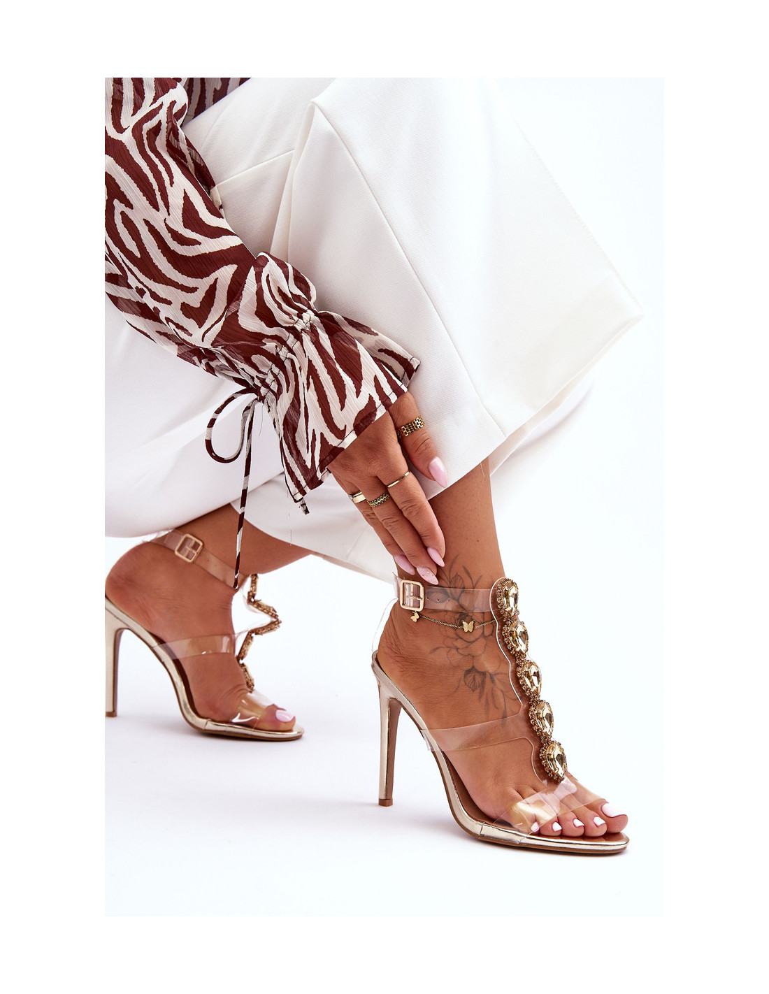 Šie nuostabūs sandalai turėtų būti jūsų drabužių spinta! Iš išorės pagaminta iš plastiko. Jie dekoruoti elegantiškais akmenimis ir kalnų krištolo imitacijomis. Vidpadis iš natūralios odos leis patogiai avėti batus. Sandalai yra ant aukštakulnio. Rinkdamiesi dydį, vadovaukitės dydžių lentele.
