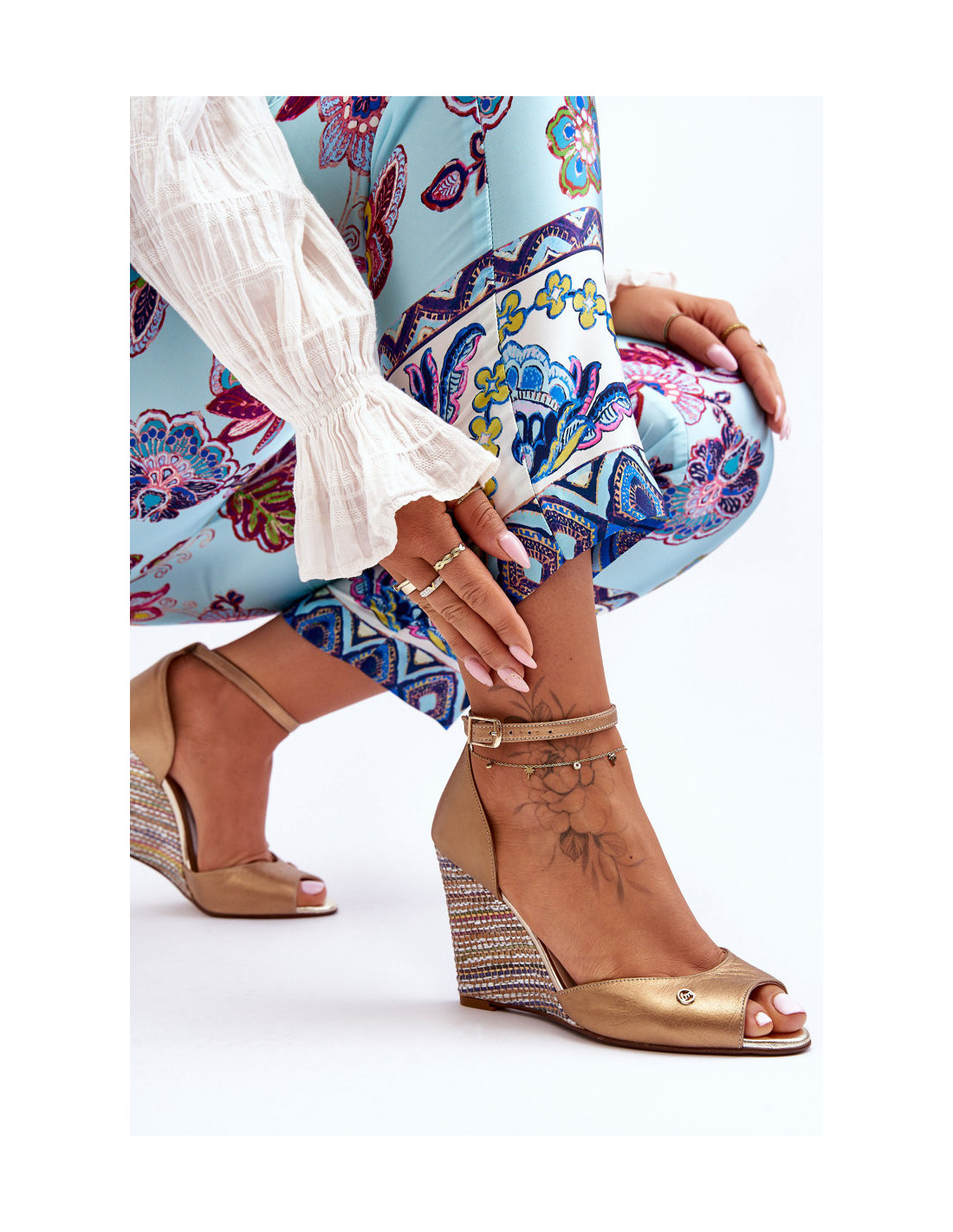 Moteriški sandalai pagaminti iš natūralios odos. Jie turi stabilų, dekoratyvinį pleištą su pynute. Minkštas vidpadis pagamintas iš natūralios odos ir užtikrins patogumą naudojimo metu. Šis modelis aplink kulkšnį užsegamas reguliuojamu dirželiu su sagtimi. Batai puikiai tinka daugeliui progų. Rinkdamiesi dydį žiūrėkite dydžių lentelę.