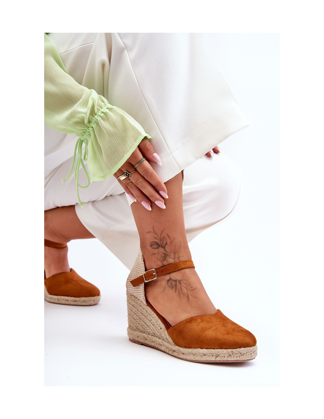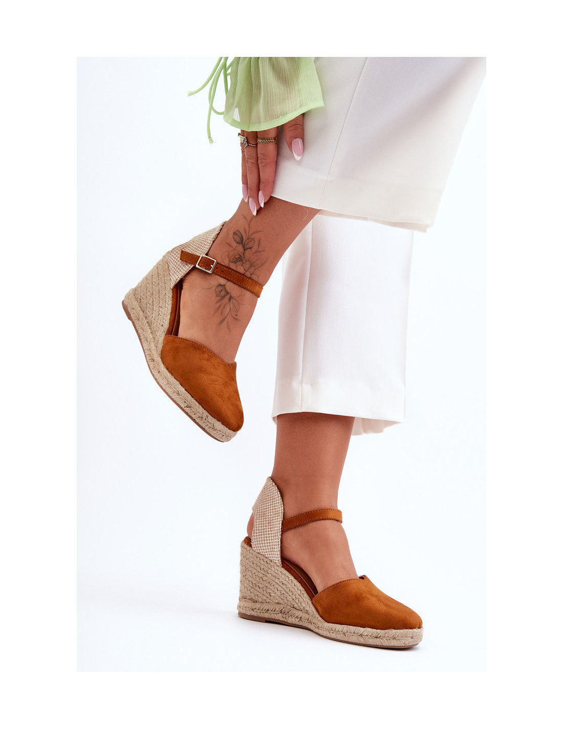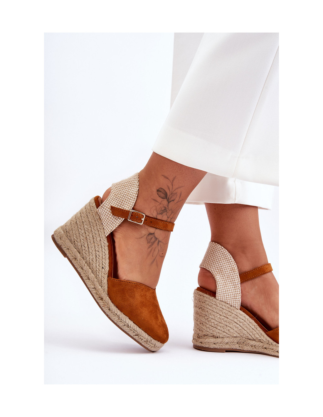 Šie madingi moteriški sandalai yra pagaminti iš ekologiškos zomšos ir audinio derinio. Sandalai turi sagtį reguliuojamo dirželio pavidalu. Pleištas ir platforma dekoruoti džiuto pynimu. Šių batų padas yra guminis ir neslidus. Minkštas vidpadis pasirūpins jūsų komfortu ir patogumu. Renkantis dydį, vadovaukitės dydžių lentele.