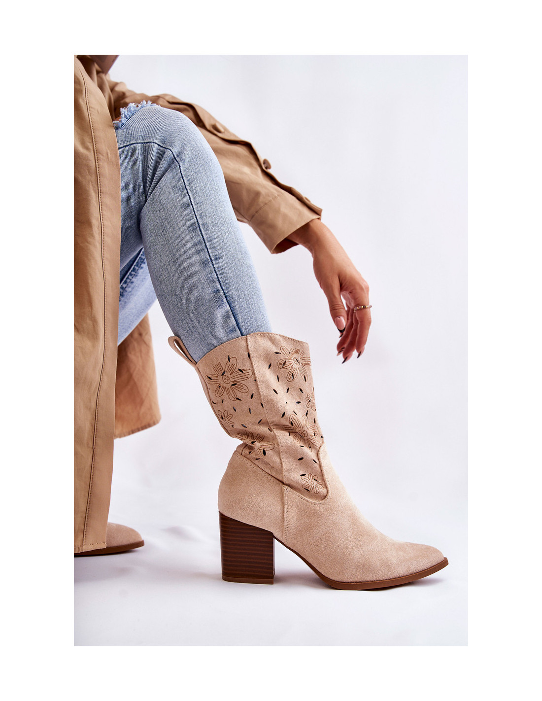 Kaubojiško stiliaus batai tvirtinami ant kulno masyvios stulpelio pavidalu. Viršutinė kulkšnies dalis subtilaus, ažūrinio rašto su gėlių motyvais. Klasikinis modelis su užtrauktuku su būdingu smailia nosimi. Pagaminta iš ekologiškos zomšos. Neapšiltinti jie puikiai tiks pereinamiesiems sezonams. Jie tinka daugeliui stilių, pavyzdžiui, prie kelnių ar boho stiliaus sijonų. Renkantis dydį, naudokite dydžių lentelę.