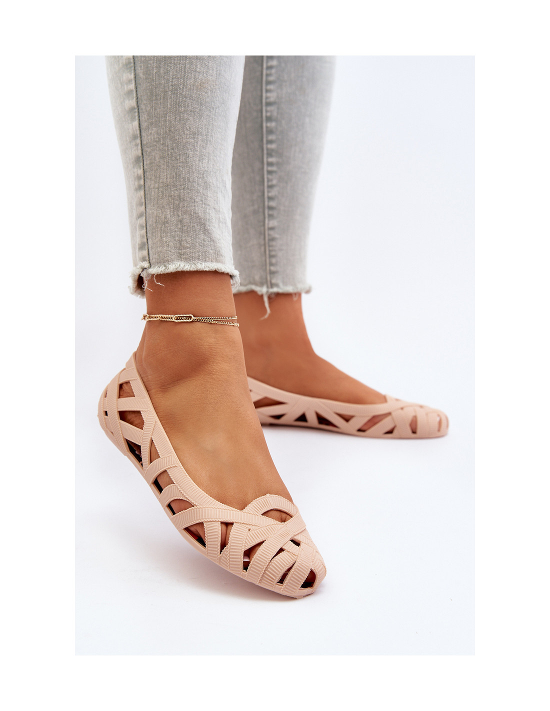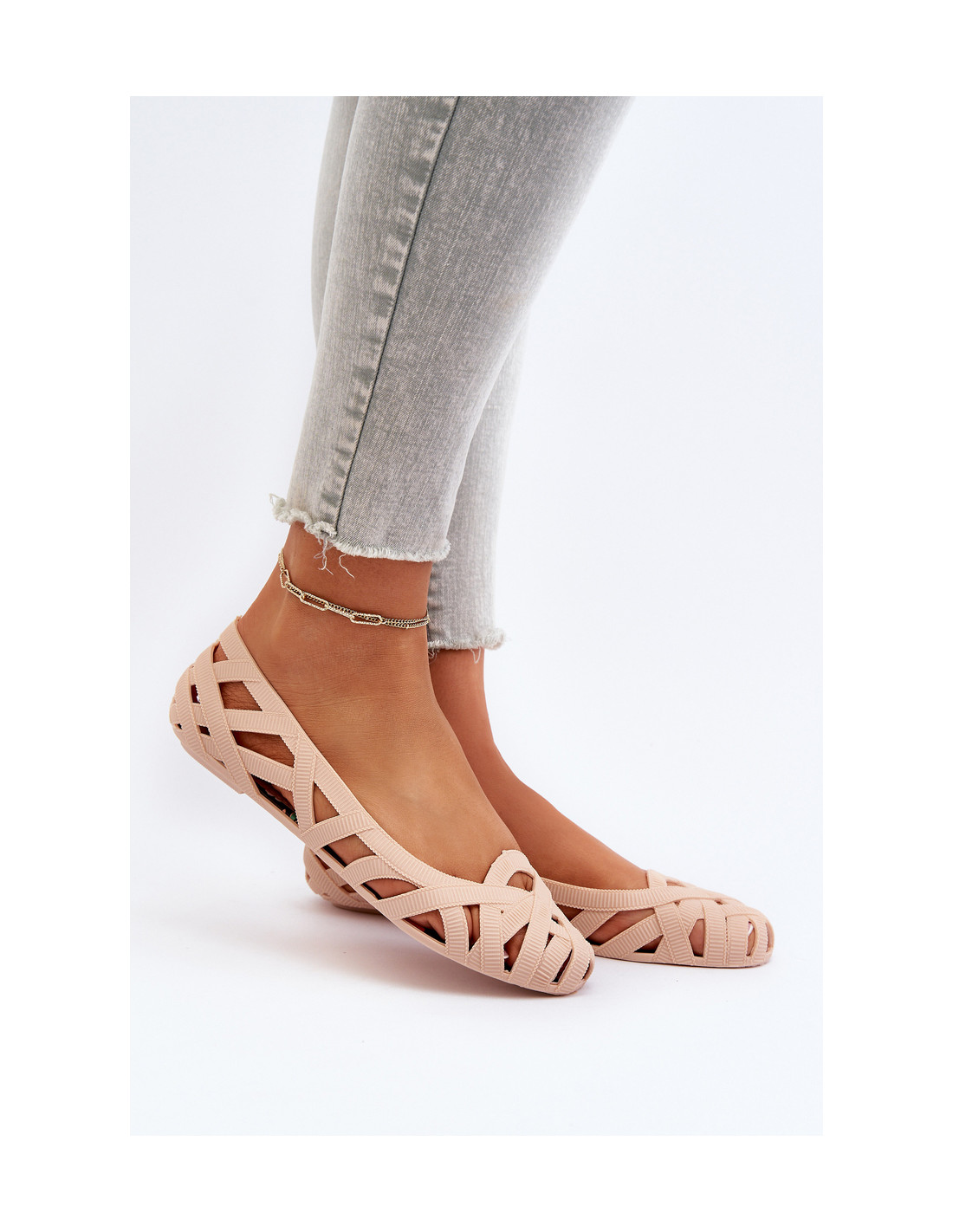 Moteriški balerinų batai pagaminti iš guminės medžiagos. Dekoratyvinis dizainas su persipynusiomis juostelėmis. Baleto butai yra ant plokščio kulno. Migdolo formos nosis. Šis modelis puikiai tinka karštoms dienoms! Renkantis dydį, vadovaukitės dydžių lentele.