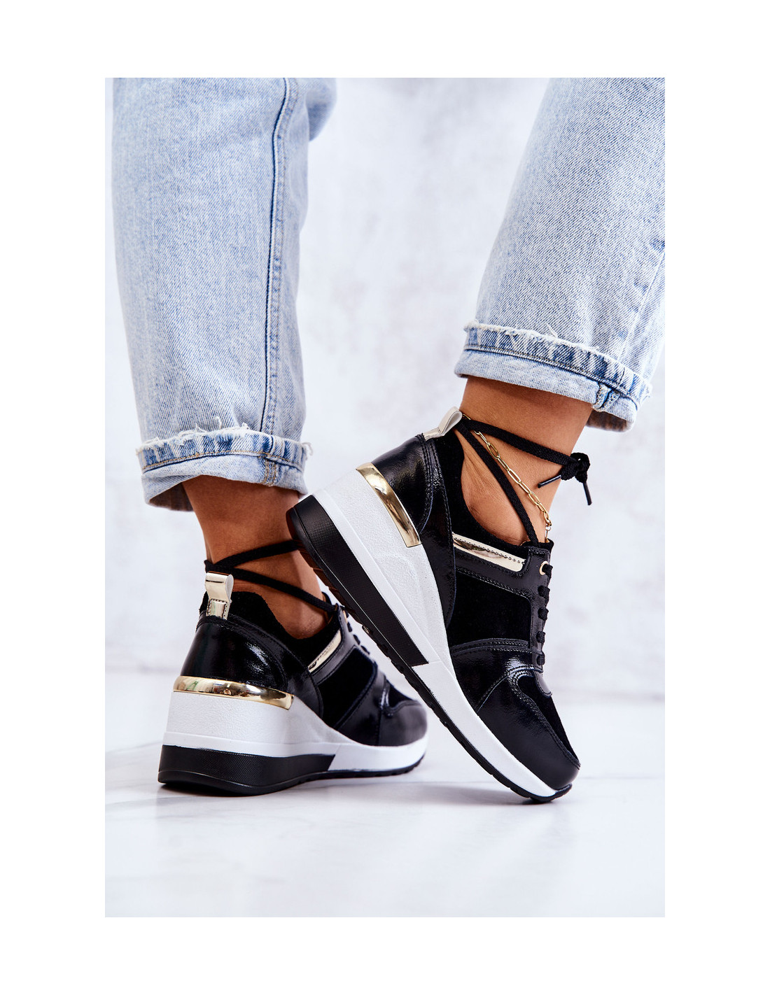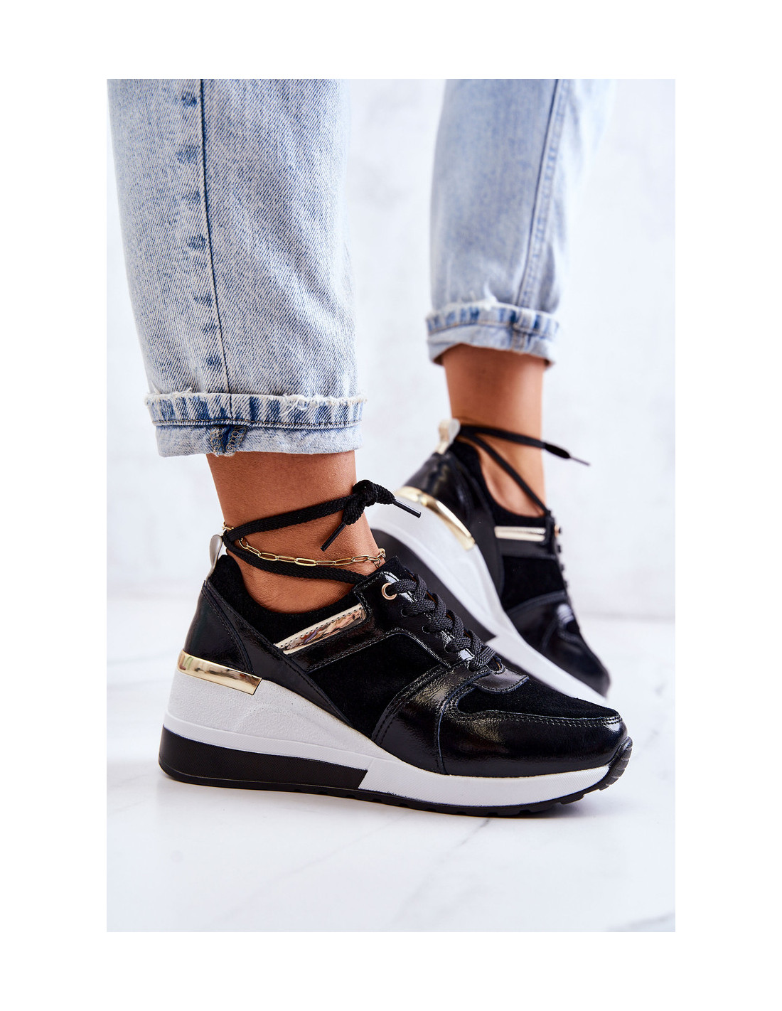 Madingi moteriški sportbačiai yra pagaminti iš natūralios, lakinės odos ir natūralios zomšos derinio. Jie yra surišti ant plokščių raištelių. Sportiniai bateliai turi pleištą su veidrodiniu įdėklu, kuris švelniai pakels figūrą. Suapvalinta nosis. Plastikinis padas. Sutvirtintas kulnas. Vidpadis pagamintas iš natūralios odos, todėl juos naudoti itin patogu ir patogu. Renkantis dydį, naudokite dydžių lentelę.