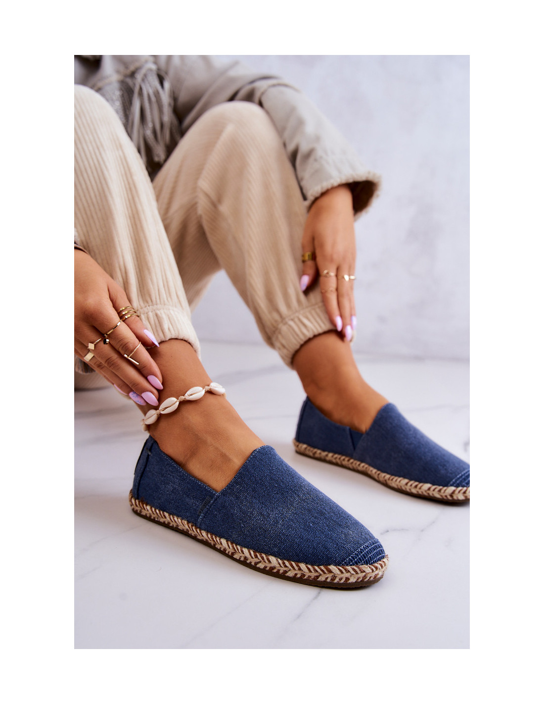 Madingi, užsegami espadriliai puikiai tinka pavasario ir vasaros sezonui. Pagaminta iš tekstilinės medžiagos su siūlėmis ant piršto. Viršutinės dalies gale yra dekoratyvinis eko odos skirtukas su Big Star logotipu. Medžiaginis vidpadis. Padas pagamintas iš guminės medžiagos, todėl yra papildomai neslidus. Pado šonai dekoruoti džiuto pyne. Jie puikiai atrodys prie suknelių ar šortų. Būtinai peržiūrėkite ir kitus espadrilių modelius! Renkantis dydį, naudokite dydžių lentelę.