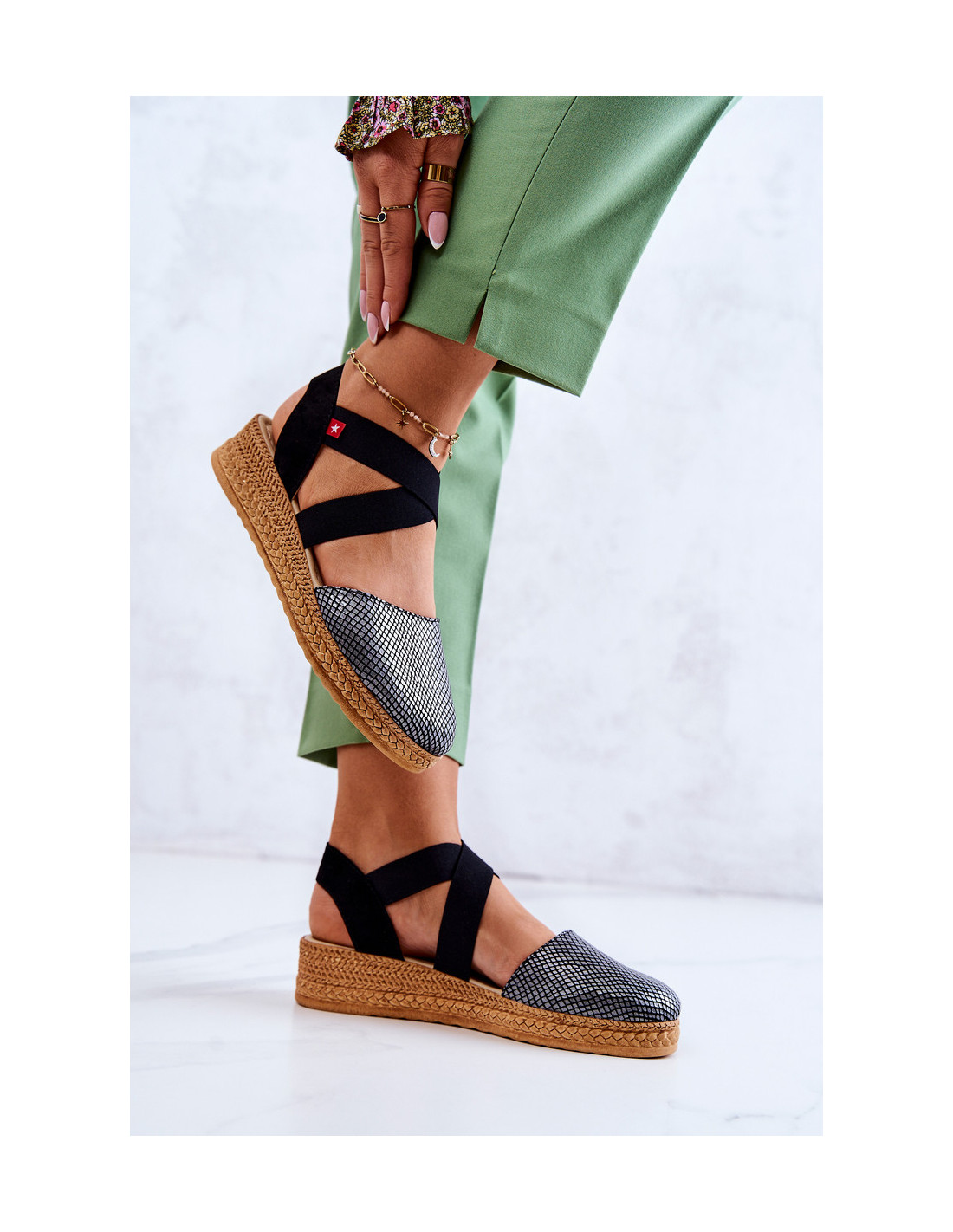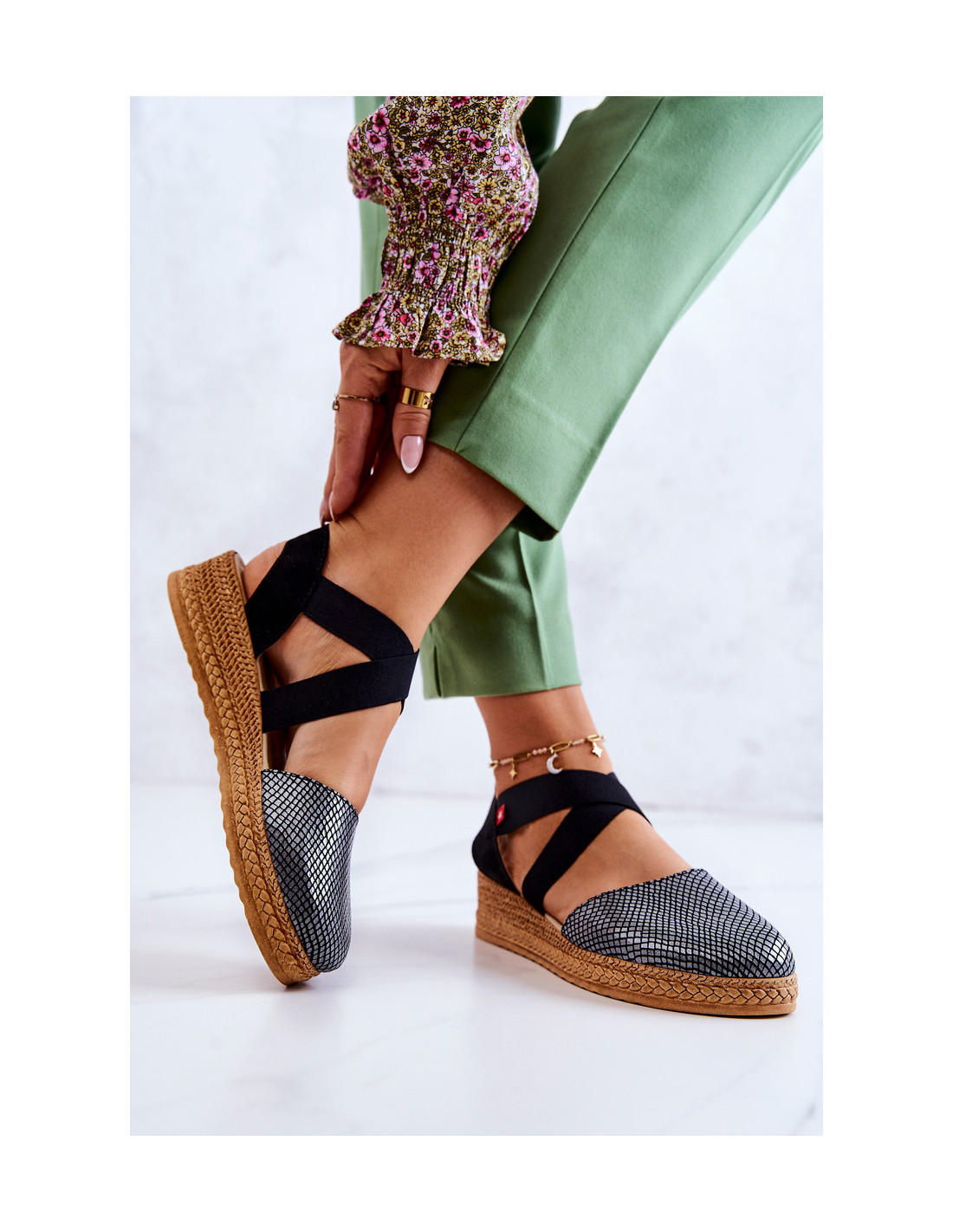 Espadrilės pagamintos iš ekologiškos odos ir ekologiškos zomšos. Minkštas, ekologiškos odos vidpadis leis patogiai dėvėti avalynę kiekvieną dieną. Suapvalinta nosis. Slip-on modelis su elastinėmis juostomis, kurios leidžia priderinti avalynę prie kojų pločio. Platforma iš plastiko, dekoruota raštu ir blizgučiais. Puikus modelis vasaros dienoms. Puikiai tinka boho ir kasdieniniam stiliui. Būtinai peržiūrėkite kitus mūsų pasiūlyme esančias espadrilių modelius! Renkantis dydį, naudokite dydžių lentelę.