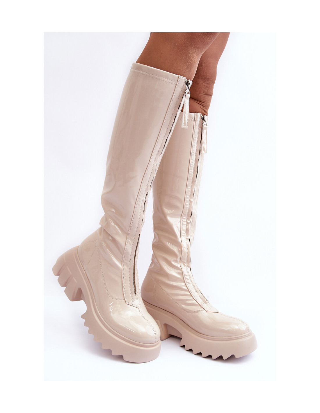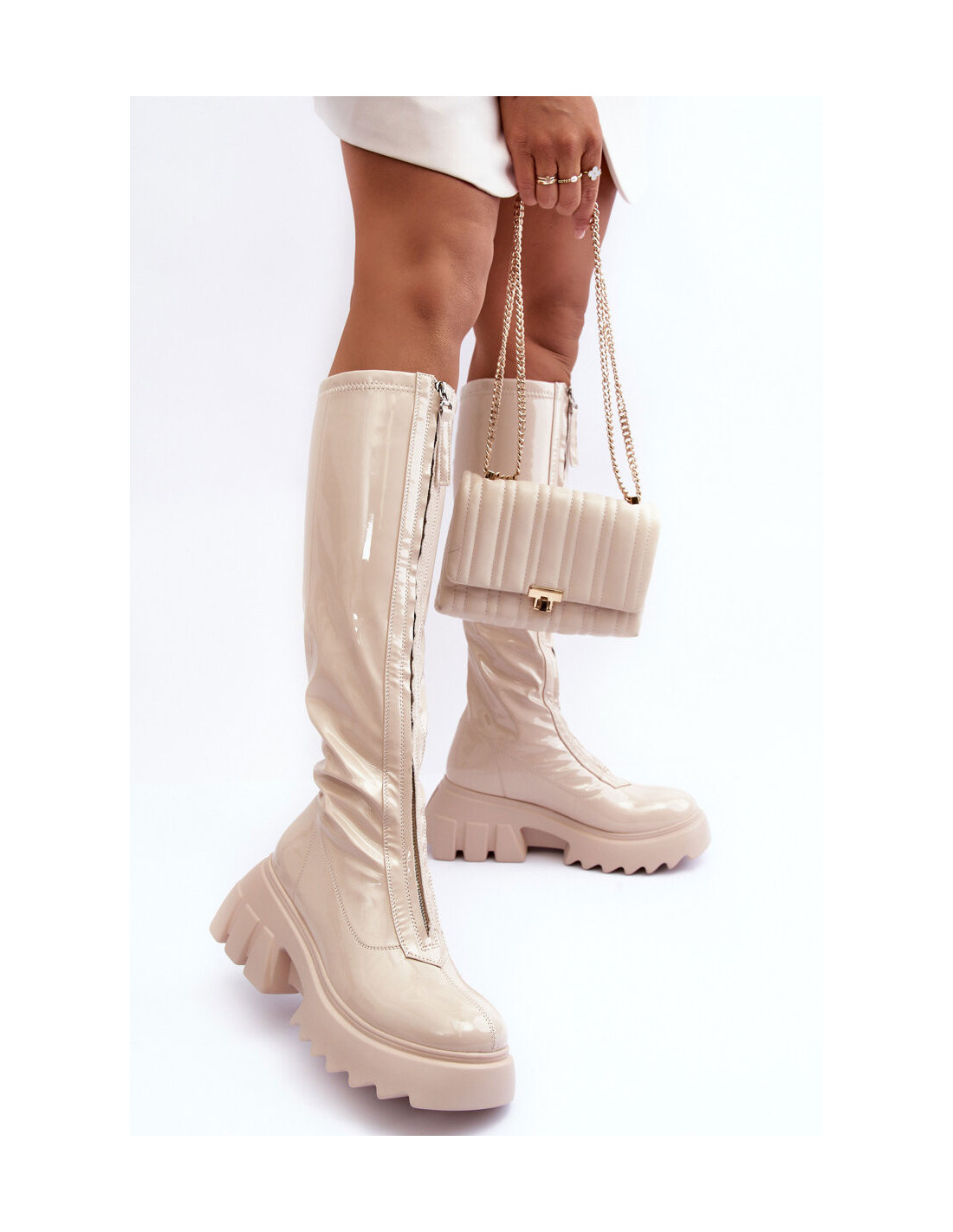 Madingi moteriški batai iki kelių. Pagaminta iš eko odos. Nustatyta ant masyvios platformos ir plokščio kulno. Modelis užsegamas užtrauktuku, kuris eina per visą viršutinės dalies ilgį iš priekio. Kojos pirštas sustingęs, galiukai suapvalinti. Vidus išklotas batų pamušalu. Renkantis dydį, žiūrėkite dydžių lentelę.