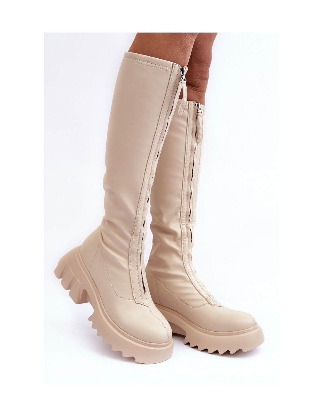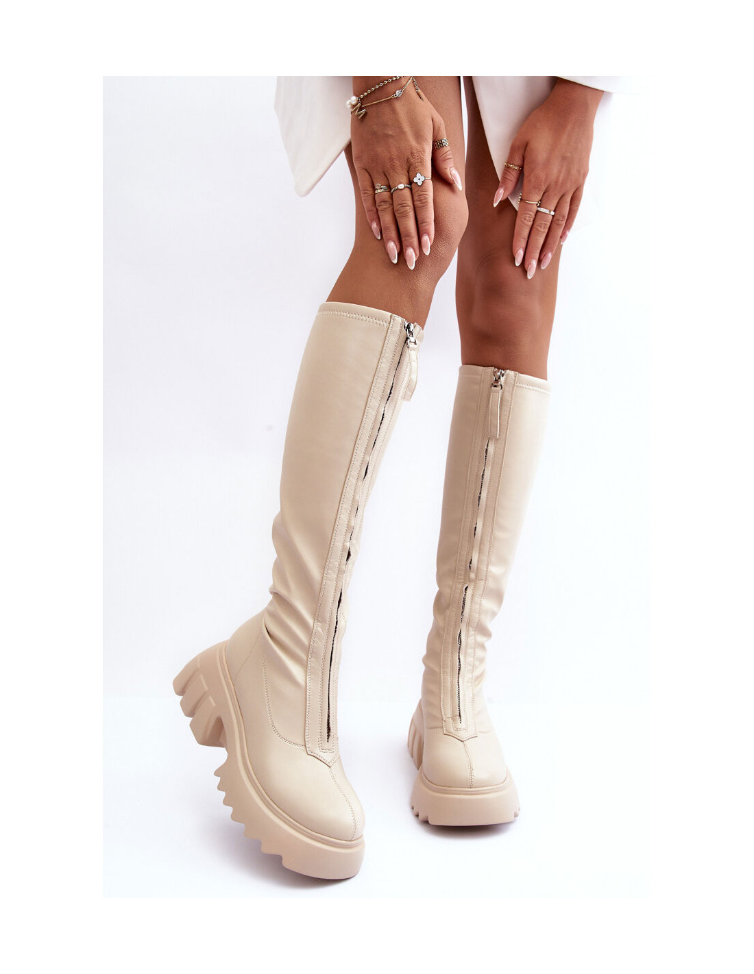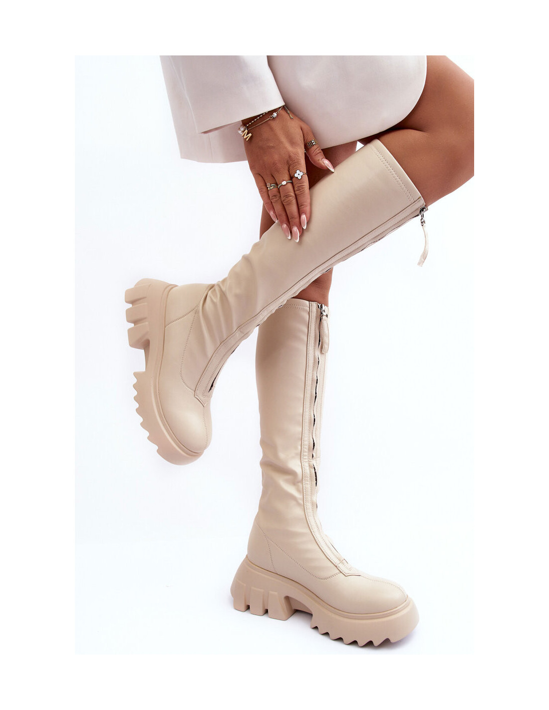 Madingi moteriški batai iki kelių. Pagaminta iš eko odos. Nustatyta ant masyvios platformos ir plokščio kulno. Modelis užsegamas užtrauktuku, kuris eina per visą viršutinės dalies ilgį iš priekio. Kojos pirštas sustingęs, galiukai suapvalinti. Vidus išklotas batų pamušalu. Renkantis dydį, žiūrėkite dydžių lentelę.