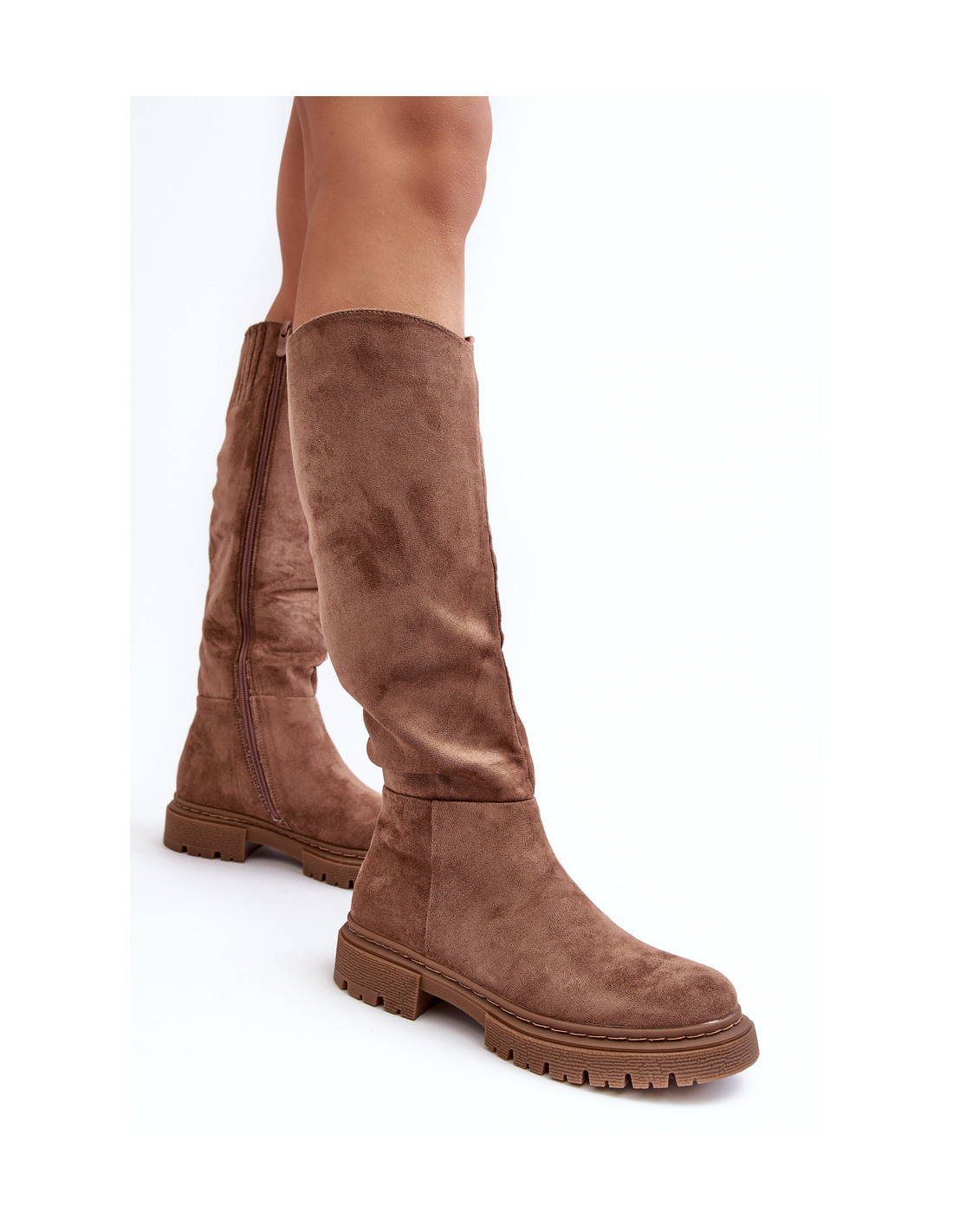 Moteriški batai pagaminti iš ekologiškos zomšos. Nustatykite ant plokščio kulno. Viršutinė dalis yra virš kelio. Suapvalinti kojų pirštai. Apšiltintas batų antklode viduje. Klasikinis kirpimas tiks prie daugelio rudens ir žiemos stilių! Renkantis dydį, vadovaukitės dydžių lentele.