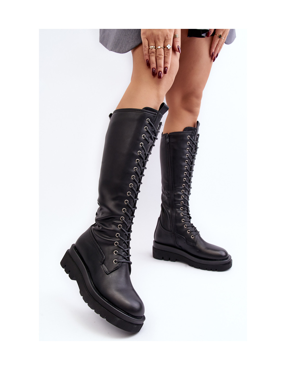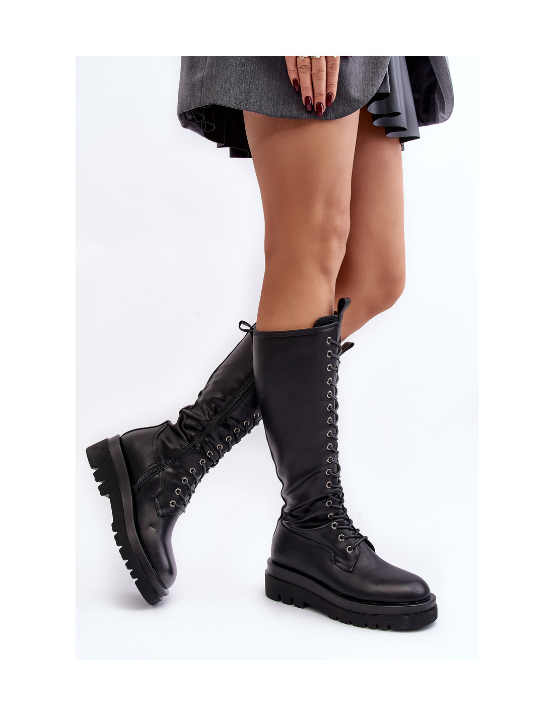 Moteriški batai – batai su platforma ir plokščiu kulnu. Pagaminta iš eko odos. Viršutinė dalis yra virš kelio. Vidus apšiltintas batų antklode. Suapvalinti kojų pirštai. Suvarstyti priekyje. Užsegamas užtrauktuku. Jūs privalote juos turėti! Renkantis dydį, vadovaukitės dydžių lentele.