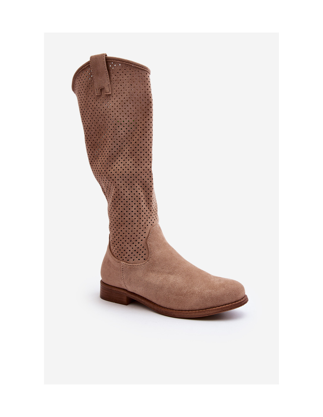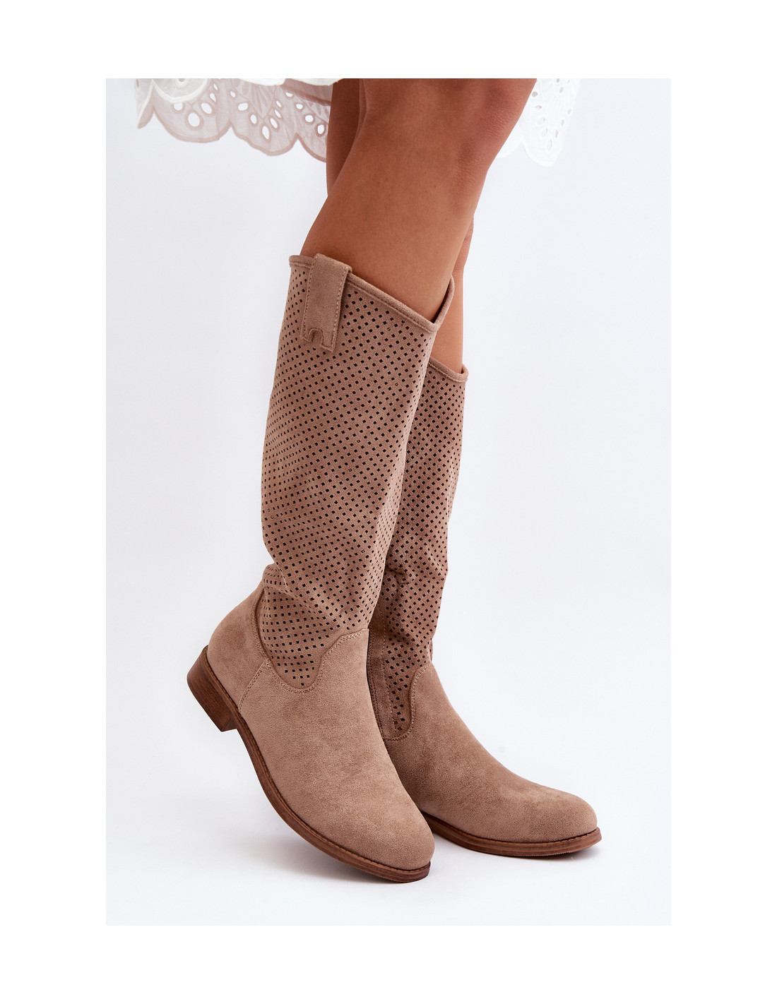 Batai su ažūrine viršutine dalimi virš kelių. Pagaminta iš ekologiškos zomšos. Statomas ant plokščio, stabilaus kulno. Užsegamas užtrauktuku. Suapvalinti kojų pirštai. Su šiais batais galite sukurti daug įdomių kasdienių stilių. Jų tikrai turėtumėte turėti savo garderobe! Renkantis dydį, vadovaukitės dydžių lentele.