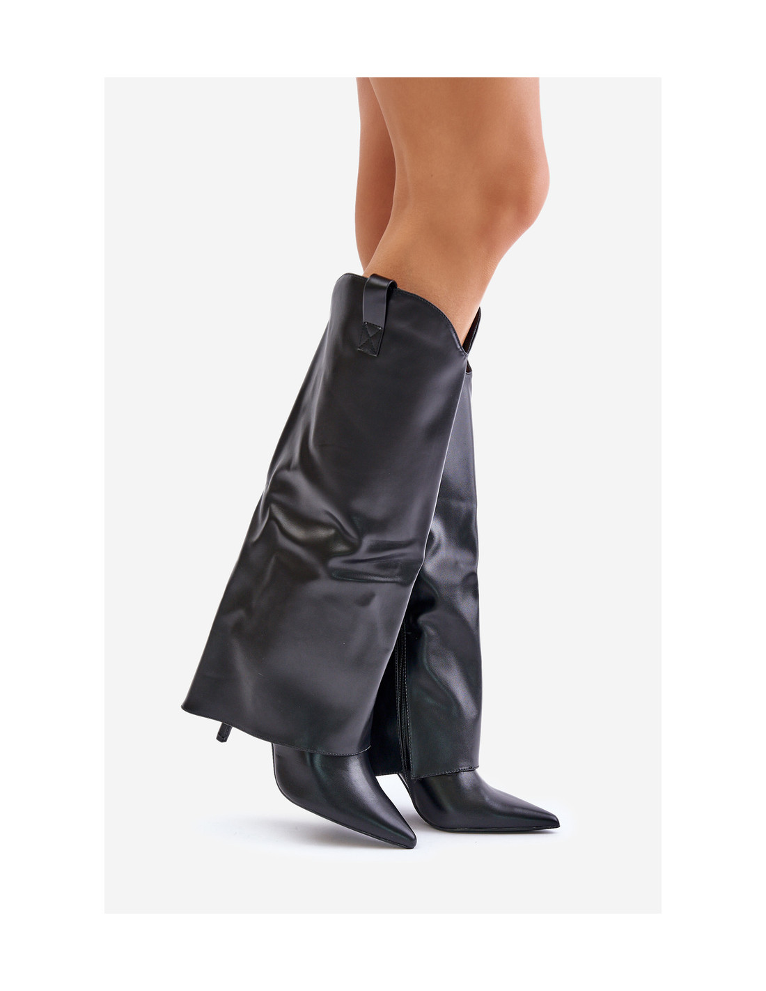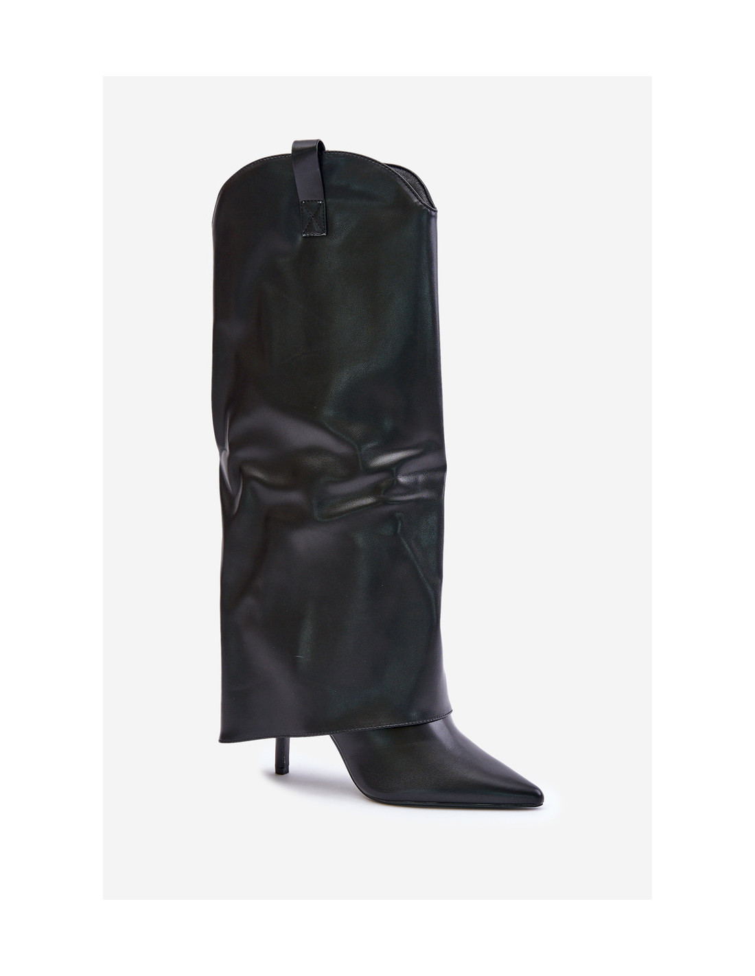 Batai yra pagaminti iš ekologiškos odos ir turi suvyniotą viršutinę dalį, kuri efektyviai perdengia kulną. Modelis turi smailius pirštus, kurie suteikia elegancijos, o šone esantis užtrauktukas palengvina batų apsiauti ir nusiauti. Uždėti ant plono stileto kulno, jie siekia kelius, pabrėždami moterišką siluetą. Puikiai tiks elegantiškam rudens-žiemos stiliui! Renkantis dydį, vadovaukitės dydžių lentele.