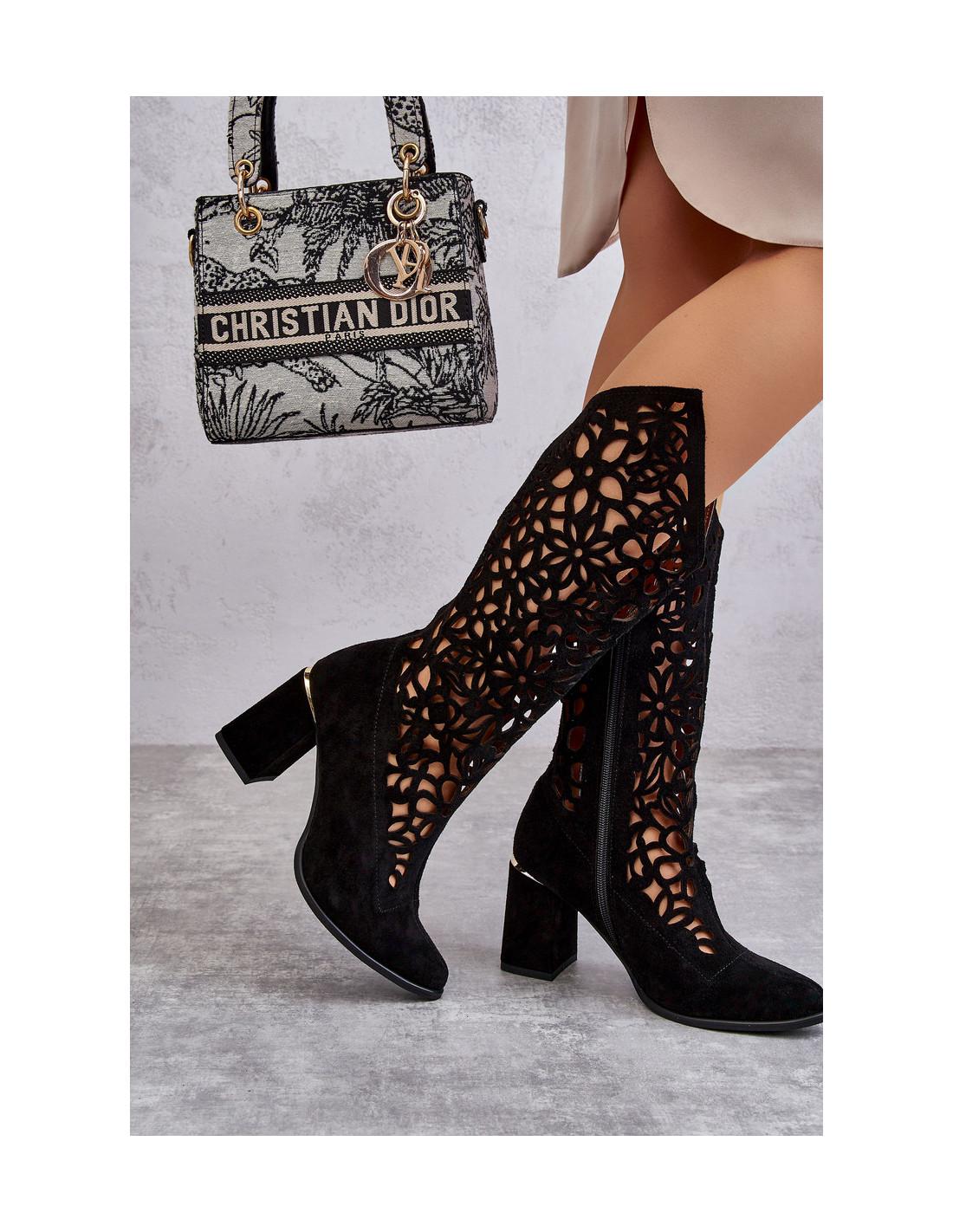 Auliniai batai su ažūriniu viršumi iki kelių ir smailia nosimi. Užsegamas užtrauktuku ir užsegamas. Jie turi standintą kulną. Pagaminta iš aukštos kokybės natūralios odos. Su šiais batais sukursite daug įdomių kasdienių stilių. Minkštas, odinis vidpadis ir stabilus stulpelio formos kulnas užtikrins komfortą naudojimo metu. Rinkdamiesi dydį žiūrėkite dydžių lentelę.