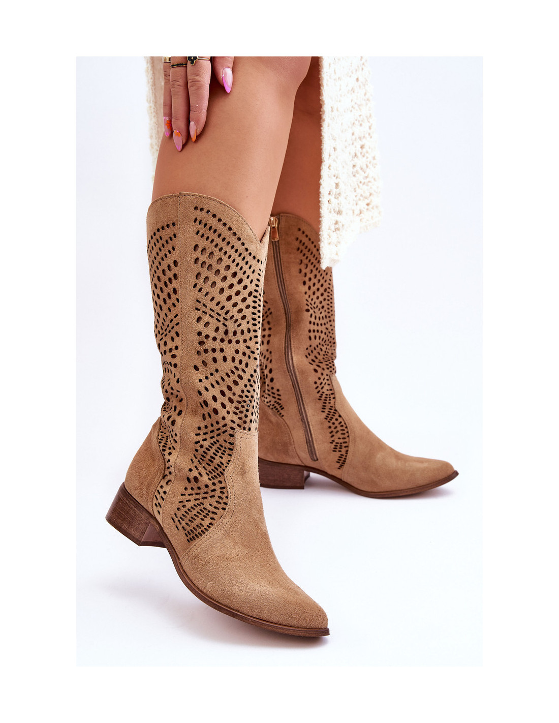 Unikalūs kaubojiški batai, pagaminti iš natūralios odos. Jie turi ažūrinį raštą viršutinės dalies aukštyje. Kaubojiški batai smailia nosimi ir plokščiu kulnu. Modelis užsegamas užtrauktuku viršutinės dalies šone. Minkštas, odinis vidpadis leis patogiai dėvėti avalynę. Be to, batai turi standintą kulno skaitiklį. Rinkdamiesi dydį, žiūrėkite dydžių lentelę.