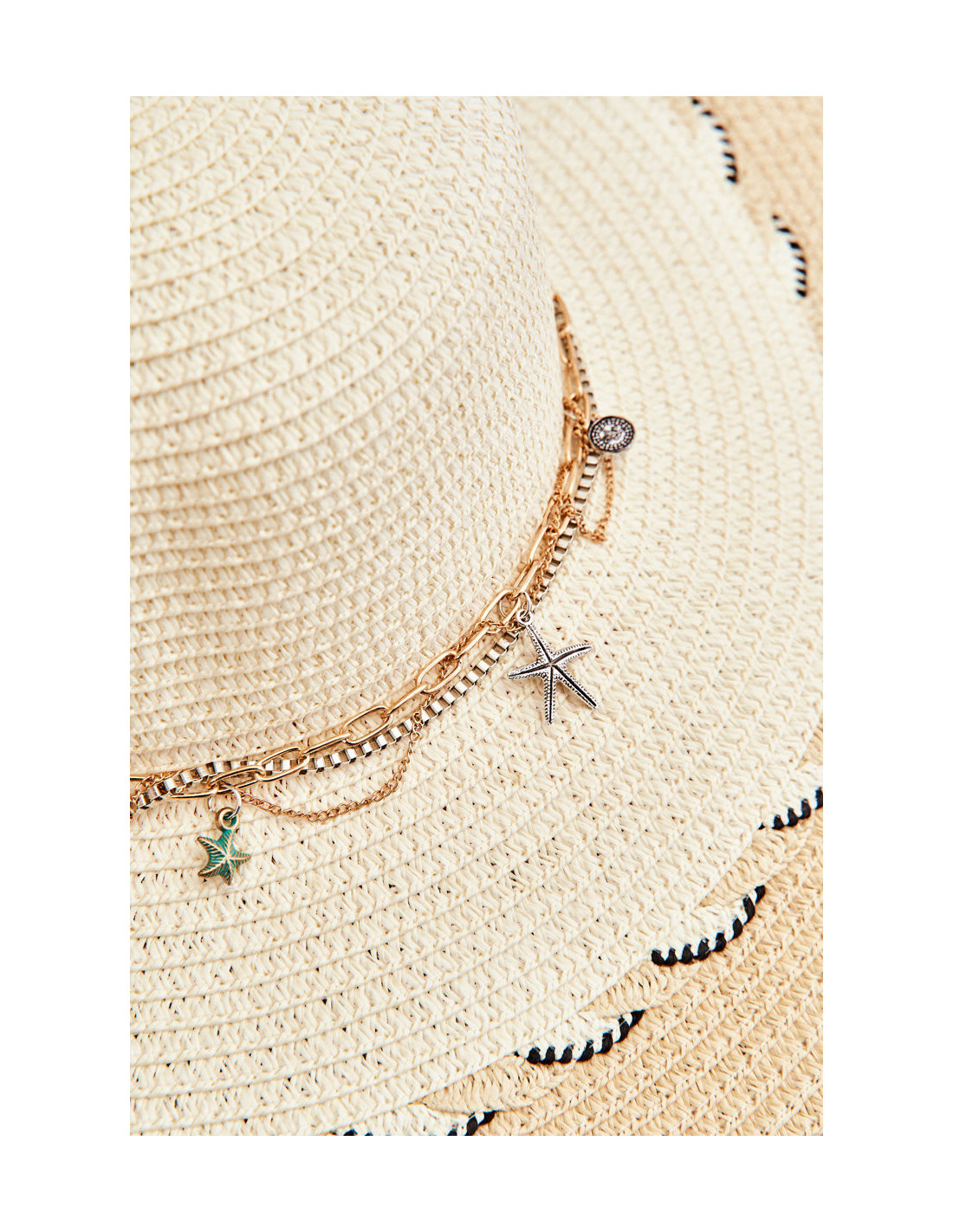 Moteriška skrybėlė pagaminta iš 100 % popieriaus. Šis modelis turi raštus ant krašto. Be to, ant dekoracijos yra priklijuota virvelė su dekoratyvinėmis grandinėlėmis ir pakabukais. Skrybėlės viduje yra juostelė, leidžianti reguliuoti perimetrą.