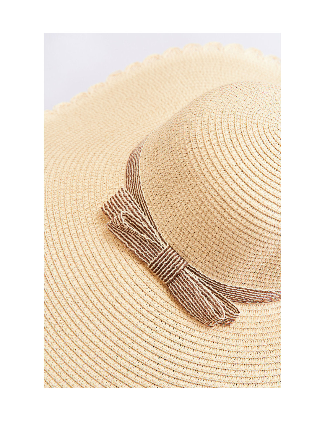 Moteriška skrybėlė pagaminta iš 100 % popieriaus. Šis modelis turi dekoratyvinę juostelę, perrištą lankeliu. Žiedinės sankryžos pakraščiuose yra raukšlių. Ši skrybėlė yra puikus modelis saulėtoms dienoms! Viduje yra juostelė, leidžianti reguliuoti kepurės apimtį.