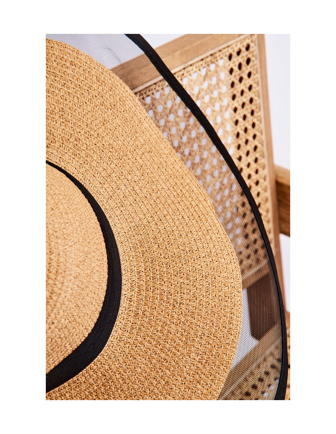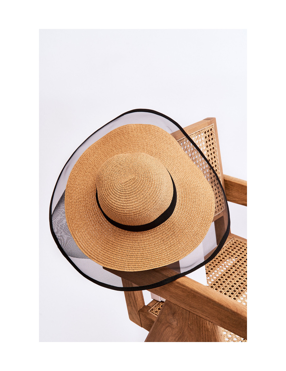 Puiki moteriška kepurė karštoms dienoms! Jis pagamintas iš 88% popieriaus ir 12% poliesterio. Skrybėlės kraštelio krašte yra dekoratyvus, pusiau permatomas tinklelis. Šio modelio viduje yra juostelė, leidžianti skrybėlę priderinti prie galvos apimties.
