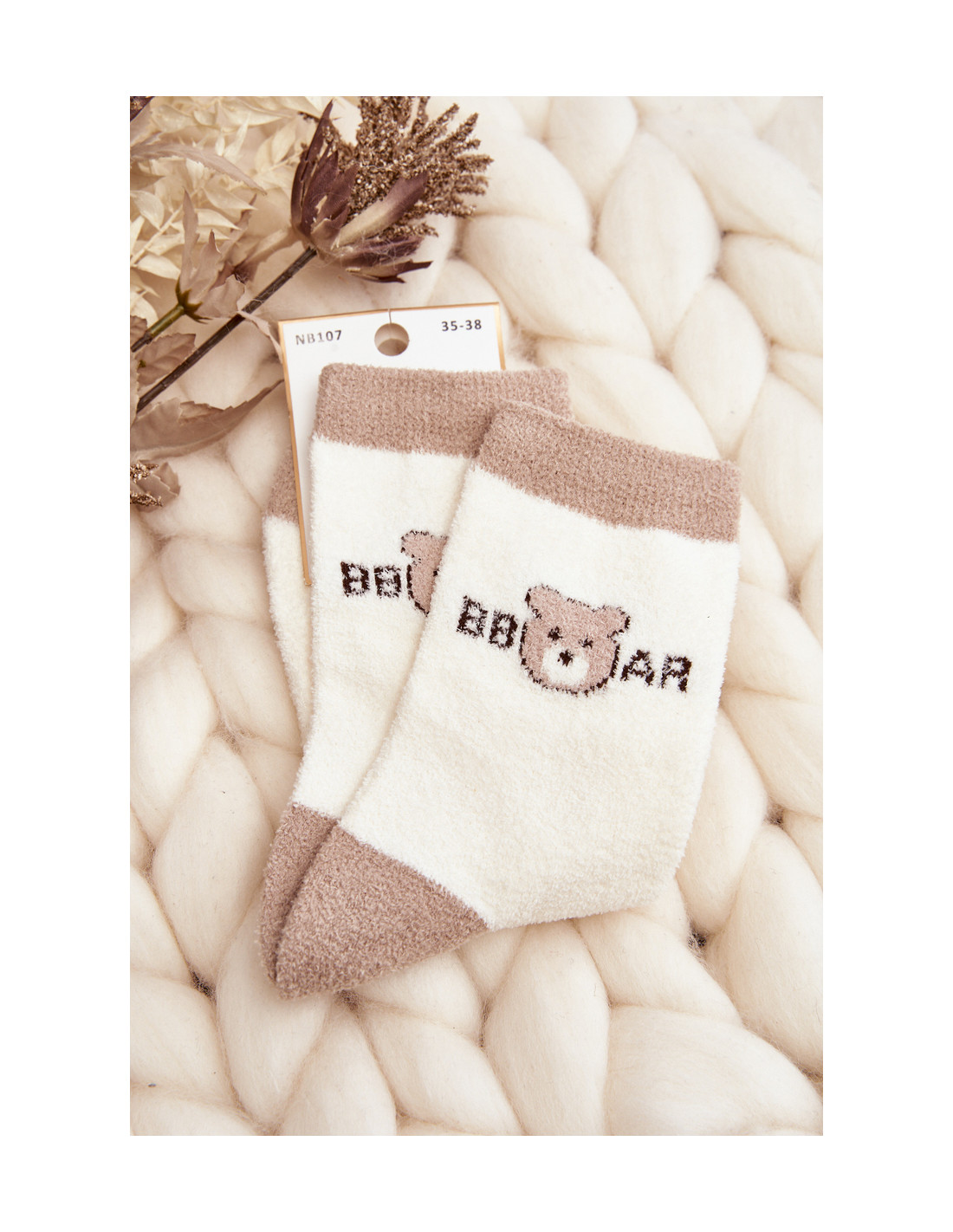 Moteriškos šiltos kojinės su meškiuku, smėlio spalvos