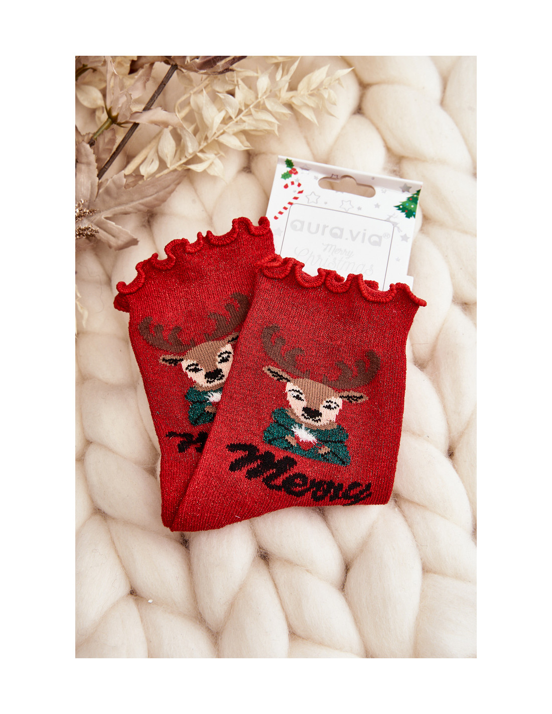 Moteriškos blizgios kalėdinės kojinės su raudonu elniu