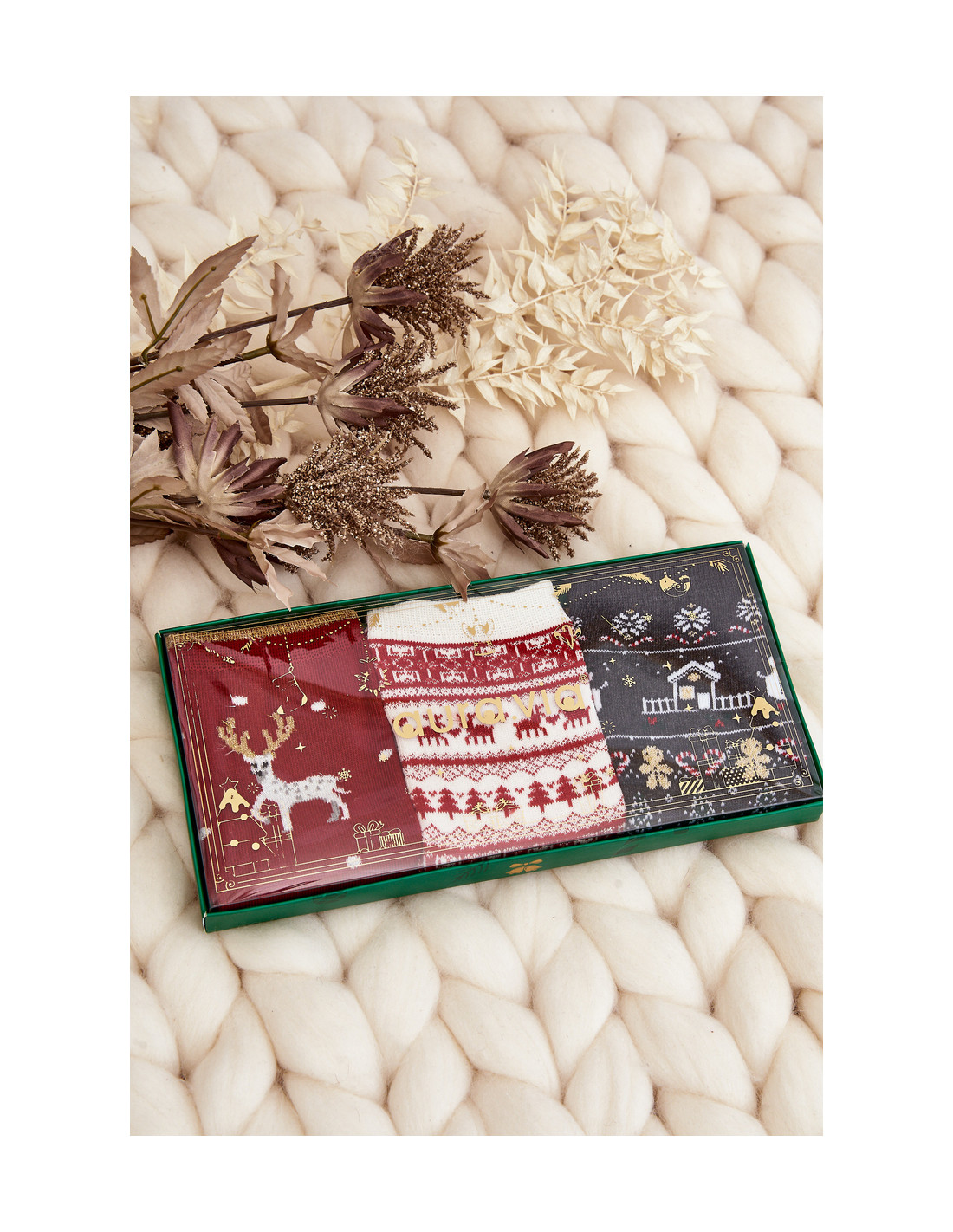 Puikus trijų porų moteriškų kojinių komplektas su kalėdiniais raštais. Tobula Kalėdų dovana kiekvienam! Pagaminta iš aukštos kokybės medvilnės. Jie turi subtilų manžetą, kuris prisitaiko prie kojos pločio.