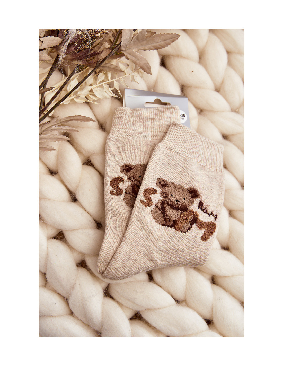 Šiltos smėlio spalvos medvilninės kojinės su meškiuku
