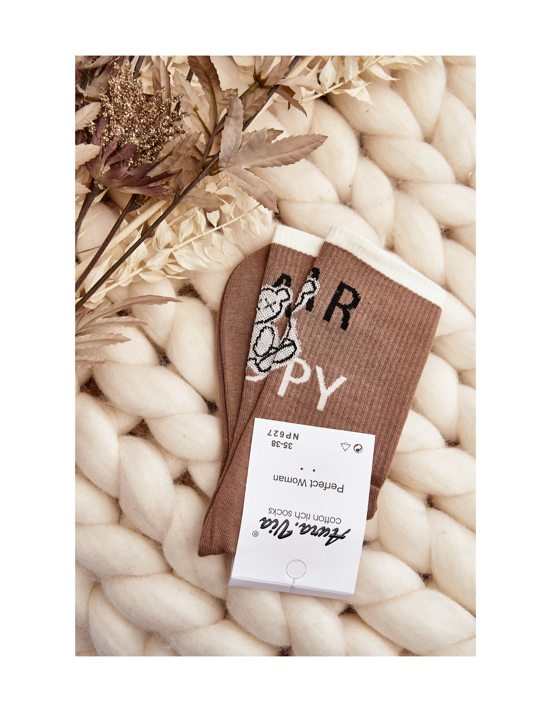 Šviesiai rudos moteriškos medvilninės kojinės su užrašu ir meškiuku