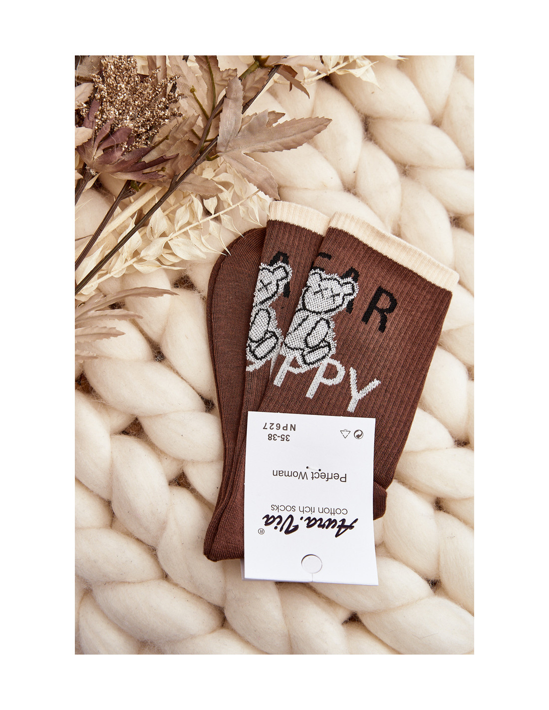 Rudos spalvos moteriškos medvilninės kojinės su užrašu ir meškiuku