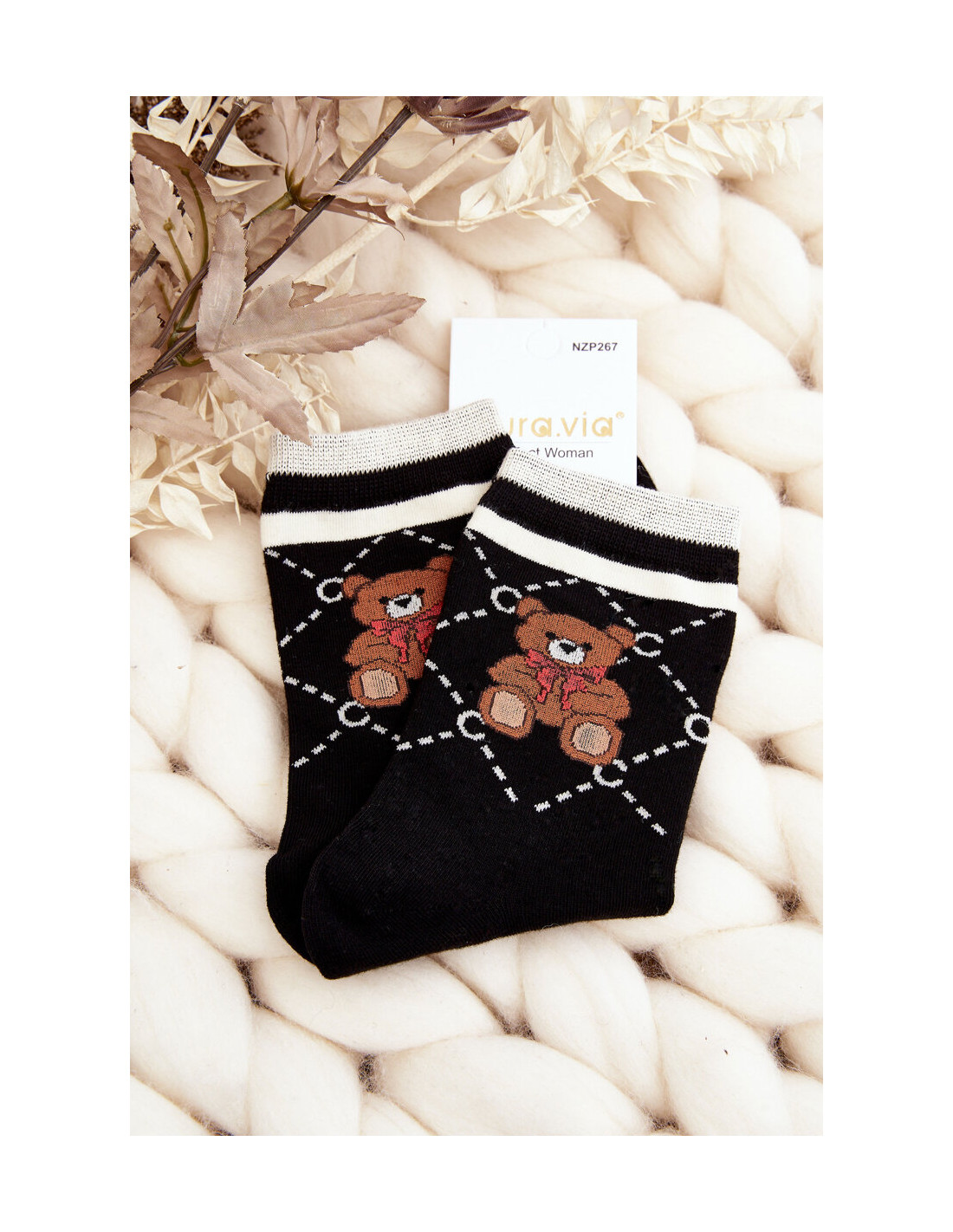 Raštuotos moteriškos kojinės su meškiukais, juodos