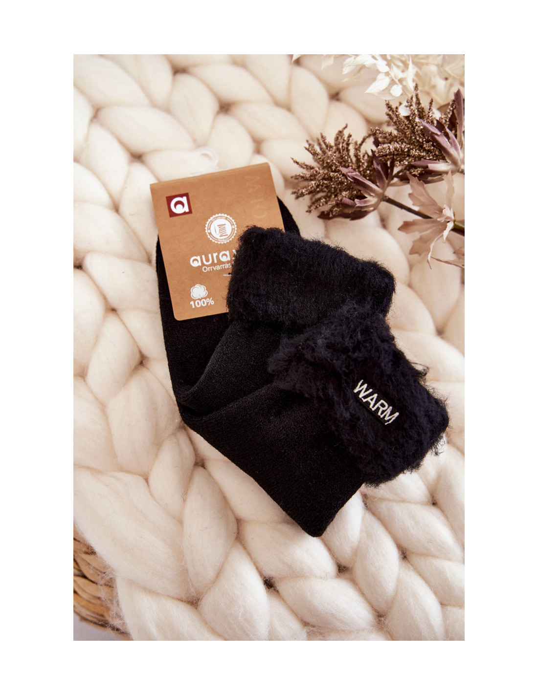 Dviejų dydžių grupių medvilninės kojinės puikiai tinka visiems, kurie vertina šilumą ir komfortą šaltesnėmis dienomis. Jie turi izoliaciją švelnaus kailio pavidalu. Ant kojinių šono yra dekoratyvinis užrašas.